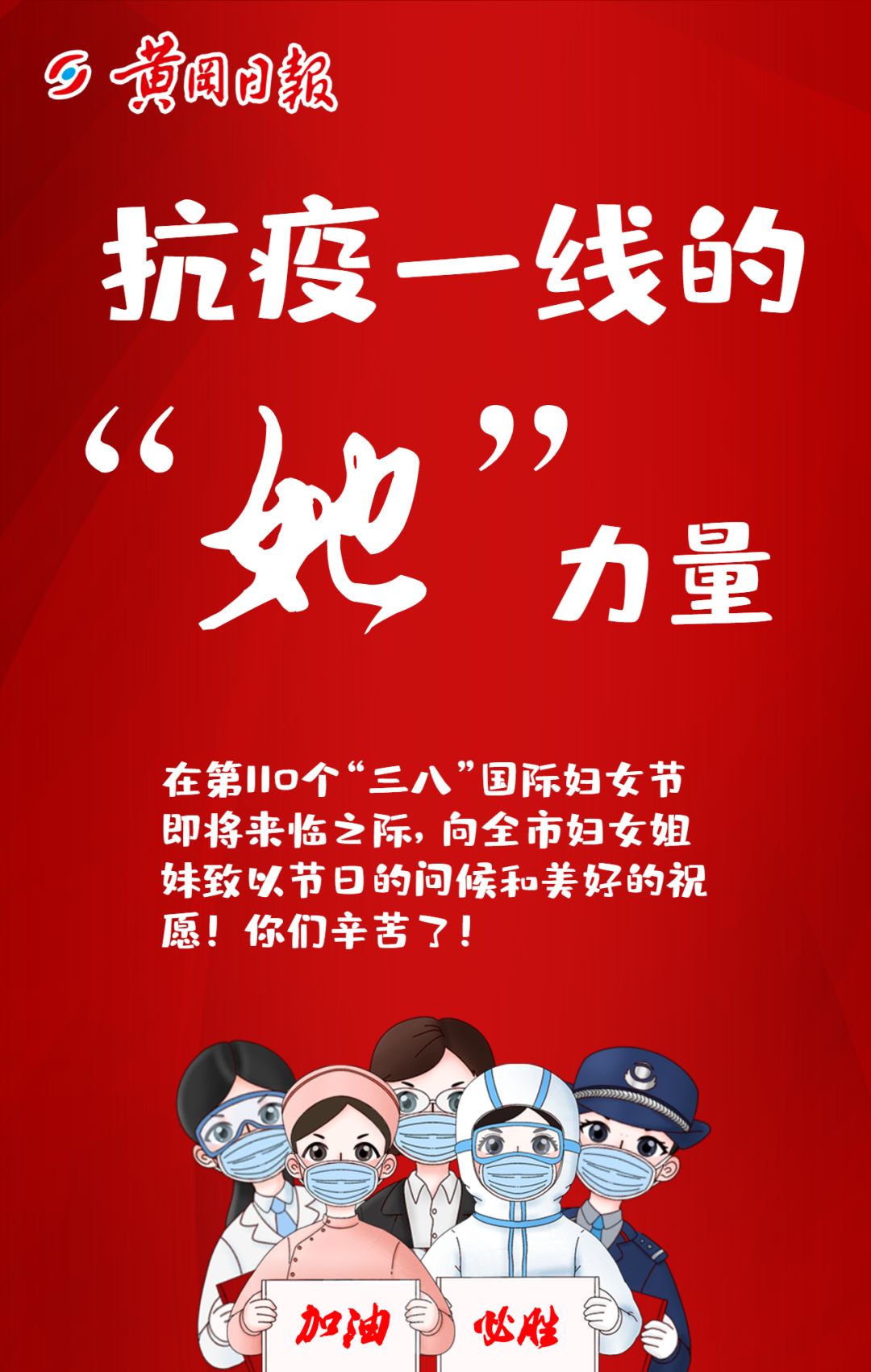 柔肩担重任,巾帼显担当。在这场没有硝烟的战争中,你们展示出了巾帼不让须眉的拼搏精神。女医务工作者不惧风险,逆行而上,在病毒手中抢救病人的生命;女公安警察、女党员干部披星戴月,风雨无悔,守护好每个卡口和社区门口;女志愿者一呼百应,众志成城,成为一线防疫的坚强后盾;女环卫工们一如既往,不畏风雨,清扫城市的每个角落,展示给我们一个美丽洁净的黄冈城。工作中,你们坚守岗位,责无旁贷,撑起了疫情防控中的“半边天”;家庭里,你们孝亲敬老,柔情守护,谱写了一曲曲可歌可泣的巾帼赞歌。