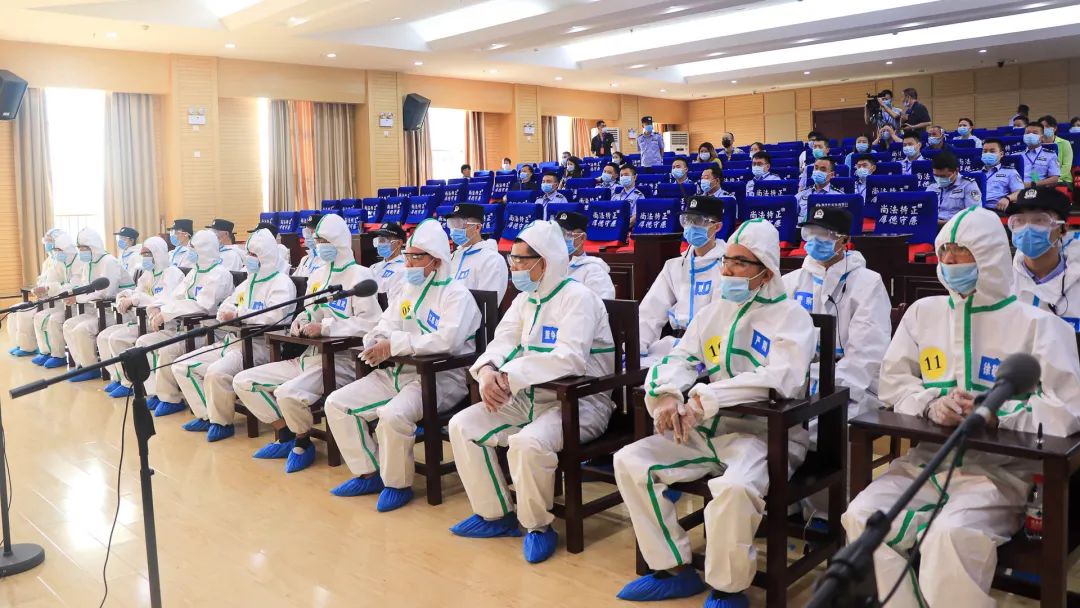 县委、市中院、县扫黑办高度重视案件审理,多次来院指导案件审理,并协调相关部门联动配合。在疫情防控常态化形势下,红安法院统筹协调、周密部署,严格防疫和安检管控,保障了庭审工作有序进行。因疫情防控需要,12名被告人身穿防护服、戴护目镜受审。