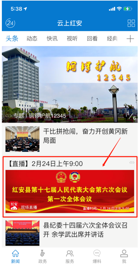红安县第十七届人民代表大会第六次会议第一次全体会议定于2021年2月24日上午9:00在县文化中心影剧院召开,县长刘堂军代表县人民政府向大会报告工作。届时红安县融媒体中心将通过电视、电台、“村村响”广播、红安网、“云上红安”APP同步直播会议实况,敬请收听收看。