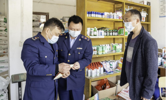 图为(3月30日)该局华家河市场监管所执法人员在农资经营店检查。