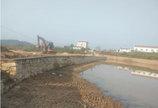 红安网消息 4月11日早晨7点20分,永佳河镇蔡庙村大畈腰塘埂上,一台挖机和几位石匠师傅正在装修已完工塘埂内墙上的护栏基脚。