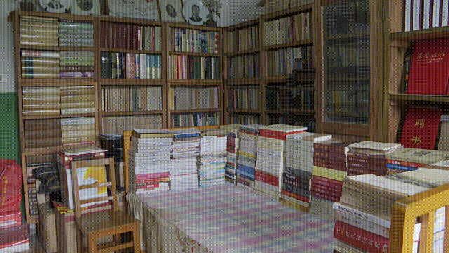 走进胡耿家中,“古火书斋”几个金色大字十分醒目,与他简朴的生活形成鲜明对比,书房内三面书架上摆满各类读物,许多书箱已经泛黄,书屋正中间的小床上也筑起一个U形的“书墙”。