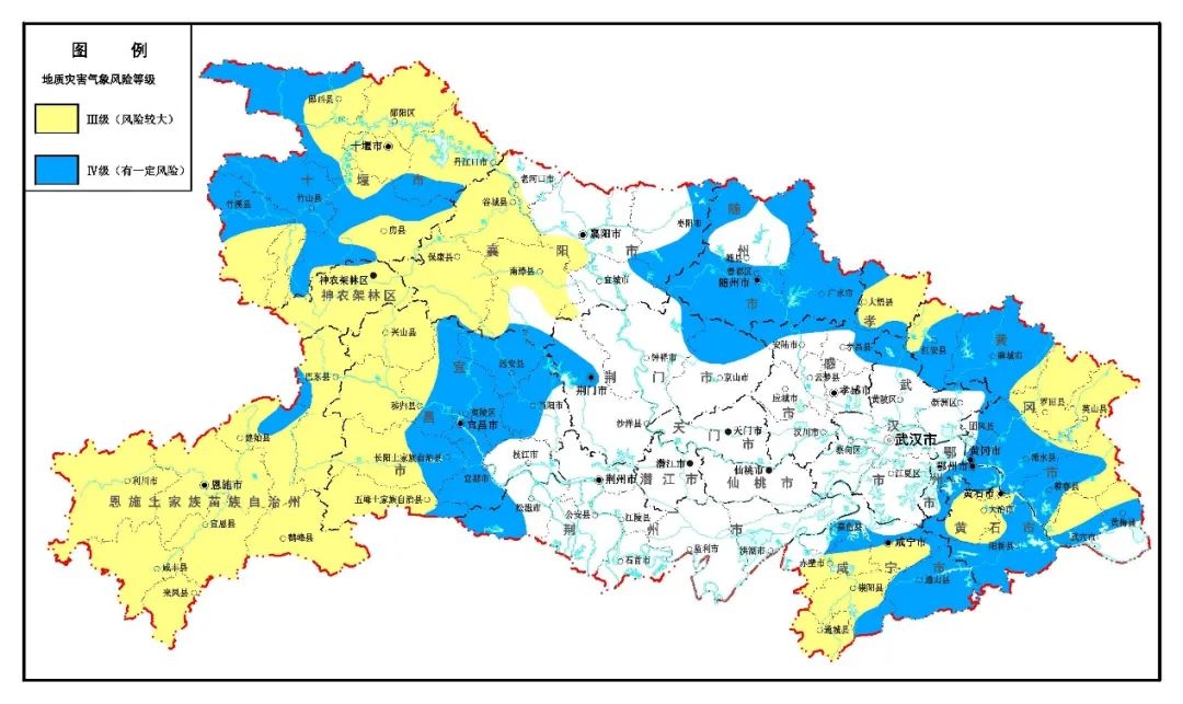 ✦ 三峡库区(夷陵中部和东部)、随州地区,十堰(郧西西部和中部、竹溪北部、竹山北部和中部、房县西部和东北部)、宜昌(宜昌城区、远安、当阳西部和中部、长阳东部、宜都)、荆州(松滋西部)、荆门(荆门西部和中部城区、钟祥东北部、京山北部)、孝感(安陆北部、孝昌北部)、武汉(黄陂北部、新洲东北部)、鄂州市、黄石(阳新大部)、咸宁(嘉鱼、通山)、黄冈(黄州区、团风、红安中部和东部、麻城、浠水中部和南部、蕲春中部和南部、武穴南部)等地,有发生崩塌、滑坡、泥石流等地质灾害的风险。