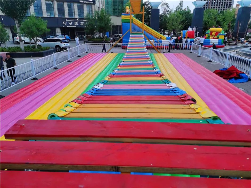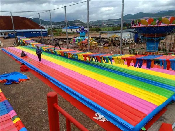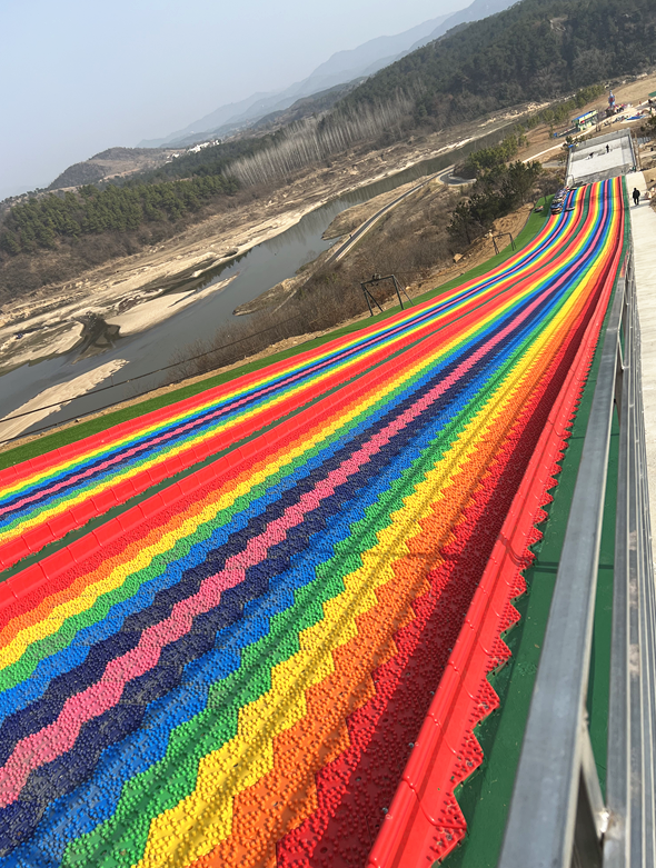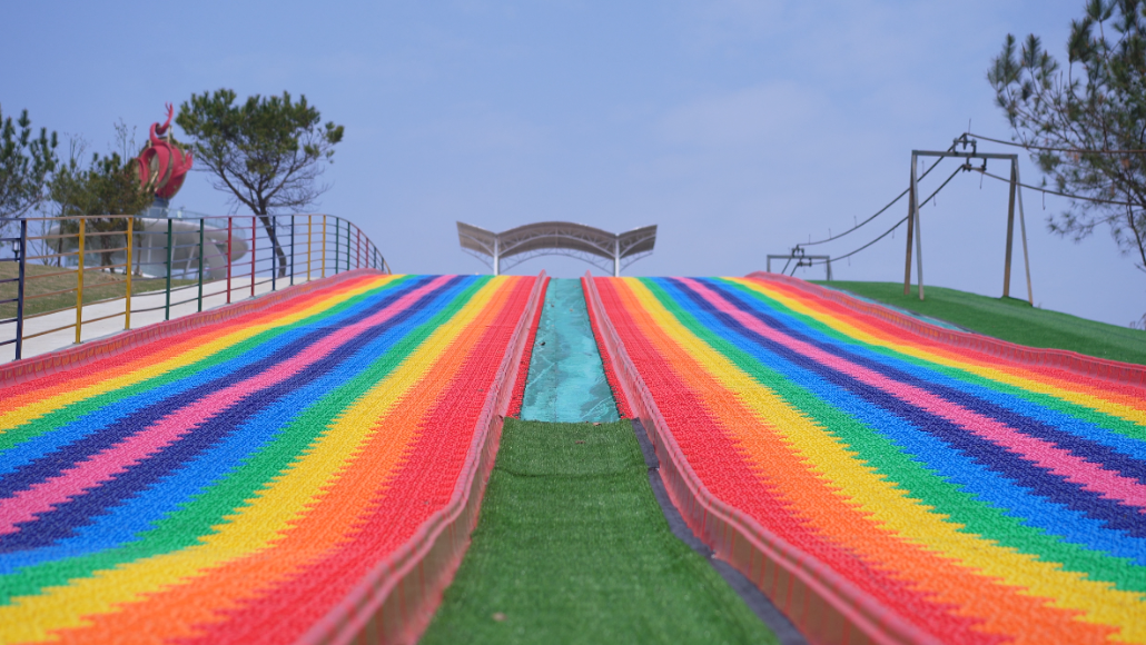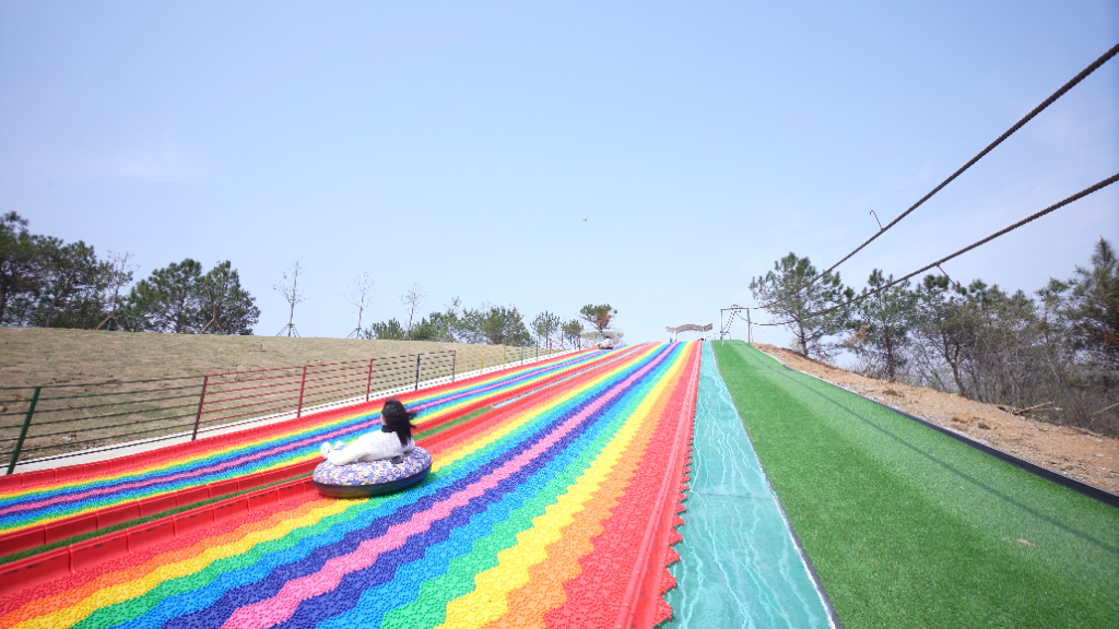彩虹滑道远望如倾泻而下的多彩瀑布,近看如惊艳耀眼的七彩云河。当您追风而下,迷失在旋转感、失控感、碰撞感的激情时;当您惊恐尖叫,感受着速度、惊险、刺激的畅快时;当您将人间美景尽收眼底,将忧愁烦恼随风而去,将快乐健康揽入怀中时,您会由衷感叹,相可心生万物,美好不过如此。