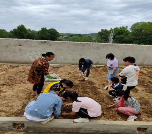 活动前,学校提前整好食堂后面的空地,制定劳动实践实施方案,为每个班分配劳动小基地,并购买劳动工具和蔬菜苗。活动中,在老师和后勤汪阿姨的指导和示范下,五六年年级的学生拿着锄头、水桶、水瓢等种植工具,开始挖坑、栽苗、浇水……同学们干得热火朝天、不亦乐乎。