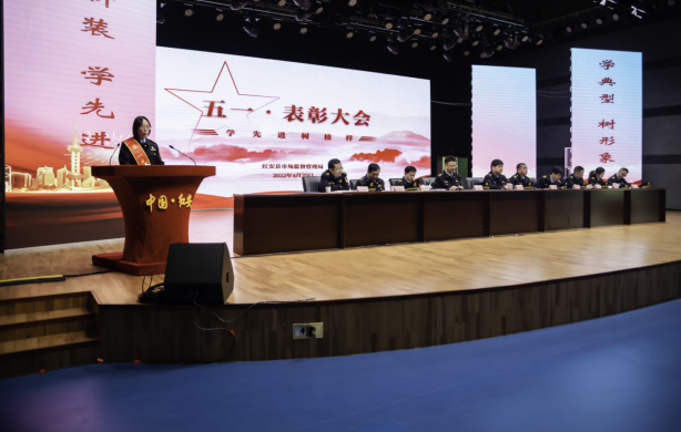 在“学身边典型,树学习榜样”先进事迹报告会上,宣读了红市监党组〔2022〕3号《关于表彰“五一”先进工作者的决定》,为10名获奖人员佩戴绶带并颁发证书。