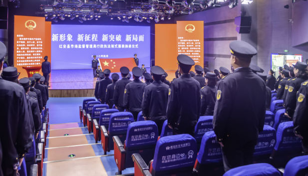 伴随着嘹亮雄壮的国歌,4名护旗手护送国旗走上主席台,换装仪式正式开始。身着新式执法制服的市场监管局全体干部职工,面对国旗国徽,昂首挺胸,整齐队列,高举右手,在领誓人的带领下庄严宣誓。