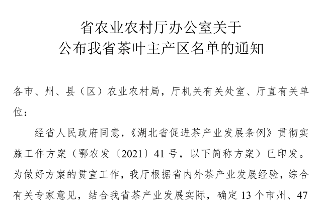 “2021年湖北省茶叶主产区”名单