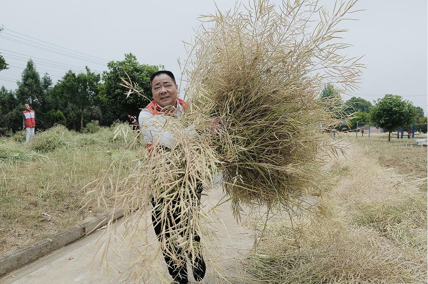 看到福利院内成熟的油菜籽待收割,红十字志愿者参与到劳动中。