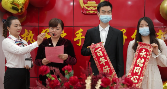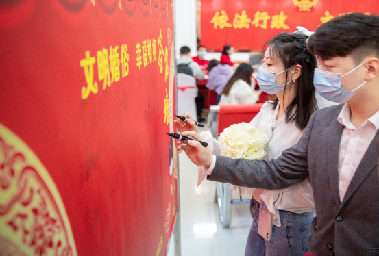 新人入场签到,在“婚事简办新办廉办倡议书”上为爱签名,郑重承诺:“不搞隆重仪式、不设豪华宴席、不用豪华车队,自觉抵制高额随礼陋习,以简约适度、绿色低碳和文明健康的方式分享新婚喜悦。”