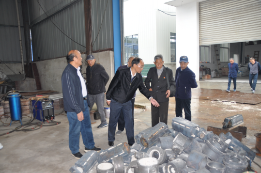(图右二为丁德典与单位老干部在工业园查看企业生产)