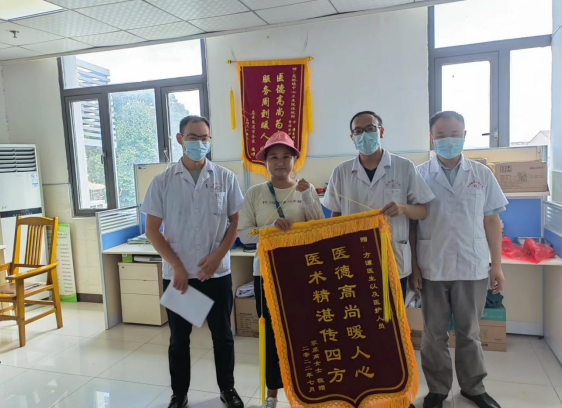 7月4日。镇卫生院为患者进行了腹壁肿物切除手术,术后行抗感染治疗,6日病检结果显示良性,高女士一颗悬着的心这才放下,在感激之余她决定给镇卫生院送一面锦旗,真诚感谢卫生院在孩子住院期间给予的精心治疗和优质护理服务。