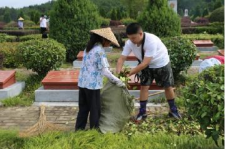 走到墓园三区的时候,队员陈佳与谢思荧看到有掉落的树枝掩盖住了一名烈士的墓碑,便快步上前,将树枝清理干净,并用手轻轻的拂去了墓碑表面的尘土。一路上,园区有很多环卫工人在清理落叶,领队李梓晗见状便上前帮忙,没有工具就用自己的手捧起落叶,帮环卫工人装到袋子里。