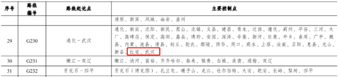 G230简称通武线,起于吉林省通化市,止于湖北省武汉市,经过吉林、辽宁、河北、天津、北京、河南和湖北7个省市,呈南北走向。红安境内起于七里坪镇檀树岗福田口(新县界),止于太平桥镇大屋墩(新洲界)。
