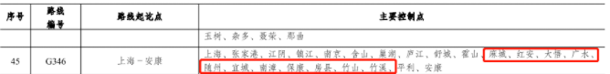 G346简称沪安线,起于上海市,止于陕西省安康市,途经上海、江苏、安徽、湖北、陕西5省市,呈东西走向。红安境内起于麻城界(蝴蝶河),止于大悟界(北岗)。