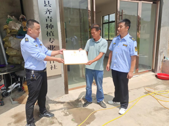 红安网消息 7月21日,红安县永佳河镇市场监督管理所将营业执照送到齐青种植专业合作社法人代表孟齐青手中。对镇市场监督管理所服务上门,孟齐青连声表示感谢说:“如果不是你们热情服务,登门做工作,我想不都不敢想去流转撂荒田五百多亩,种植水稻,真是太谢谢你们啦!”