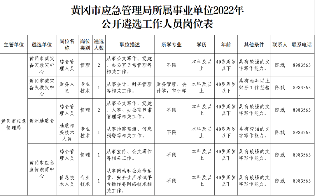 遴选岗位及资格条件详见《黄冈市应急管理局所属事业单位2022年公开遴选工作人员岗位表》。