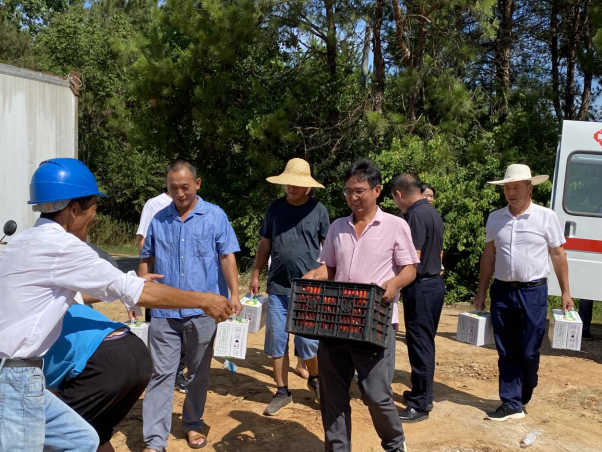 红安网消息 8月11日上午,高桥镇中心卫生院负责人来到高桥镇程河村“红色美丽村庄”建设工地上慰问一线农民工们,为他们发放了西瓜、皮蛋等降温物资,嘱咐他们要科学合理安排作息时间,保护好自身的健康和安全。