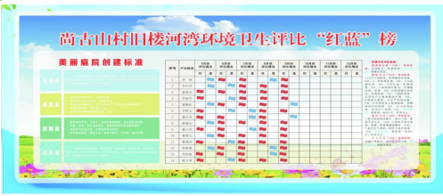 环境卫生评比“红蓝榜”是尚古山村推出的又一款新举措,每月由“环评专班”到各家各户开展环境卫生大评比,依据考评标准打分,80分以上得“红旗”,80分以理各“蓝旗”,一月一评,一月一公示,综合得分前五名的家门口挂“美丽示范农户庭院”流动牌。
