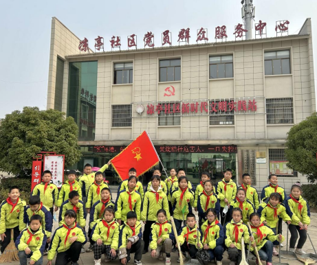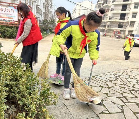 为了把雷锋精神落到实处,学校还组织少先队员们走进社区开展义务劳动,高举少先队队旗,手持劳动工具,分工协作,干劲十足。让志愿的种子在心中生根发芽。