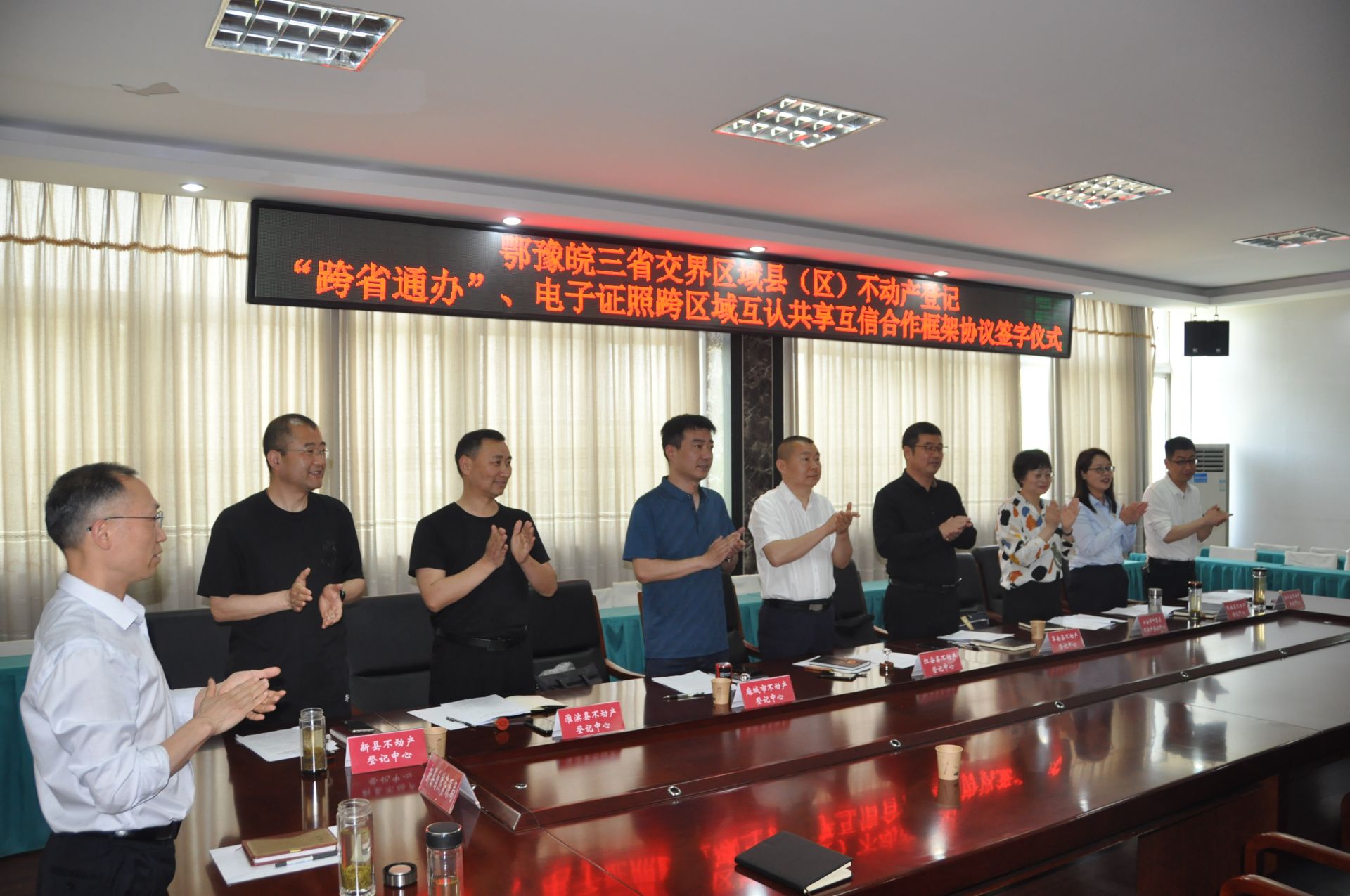 红安网消息 为进一步深化“放管服”改革,持续优化营商环境和政务服务,为企业和群众提供更高效、更便利的不动产登记服务,4月20日,红安县自然资源和规划局工作人员赴河南省新县自然资源局,与安徽省阜南县、六安市叶集区,以及河南省新县、固始县、淮滨县、潢川县,湖北省麻城市等位于鄂豫皖三省交界区域8个市县区的不动产登记机构签署不动产登记“跨省通办” 电子证照跨区域互认共享互信合作框架协议,就业务互助帮办、信息查询、证照互认共享、易地代收代转等合作细节进行约定。