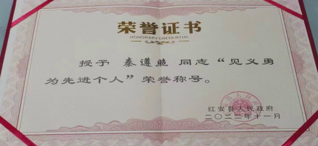 红安网消息 近日,湖北省见义勇为英雄先进表彰大会在武汉召开,会上宣读了湖北省人民政府《关于表彰湖北省见义勇为英雄及先进(群体)的决定》,杏花乡接官厅社区居民秦遵照被授予“湖北省见义勇为先进”称号。