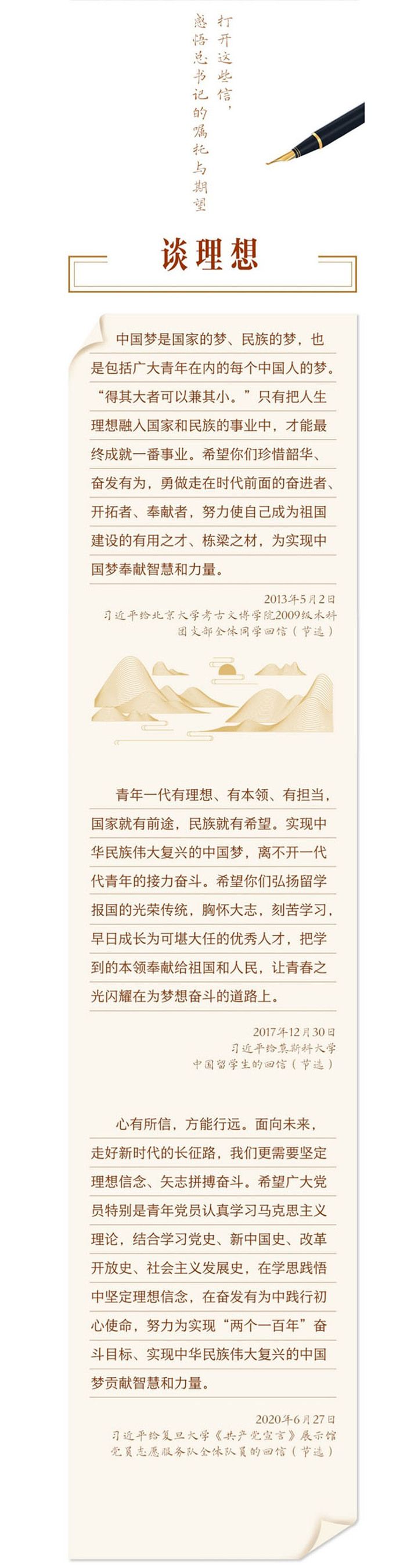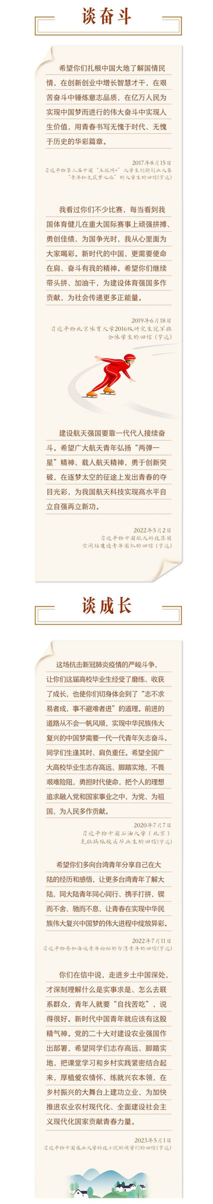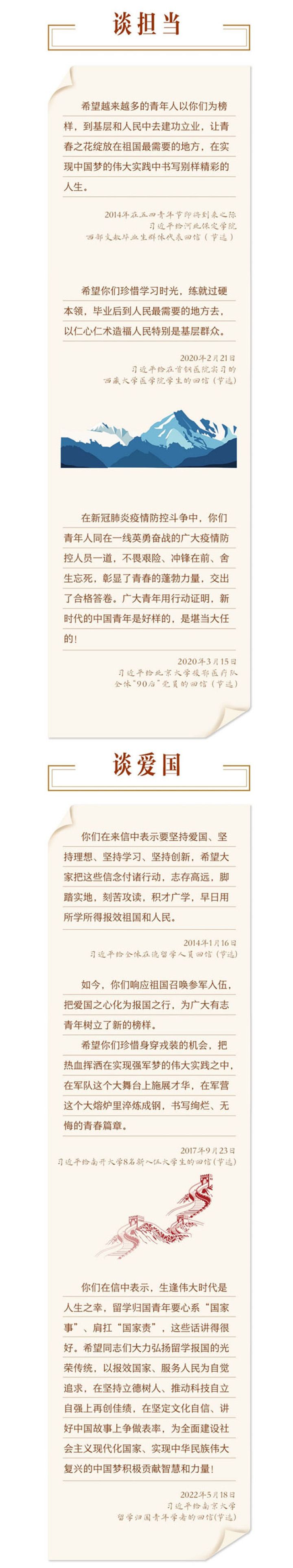 在五四青年节到来之际,让我们重温部分回信,从总书记与青年朋友谈理想、谈担当、谈爱国、谈奋斗、谈成长的字里行间,感悟总书记对青年的深情嘱托与殷切期望。