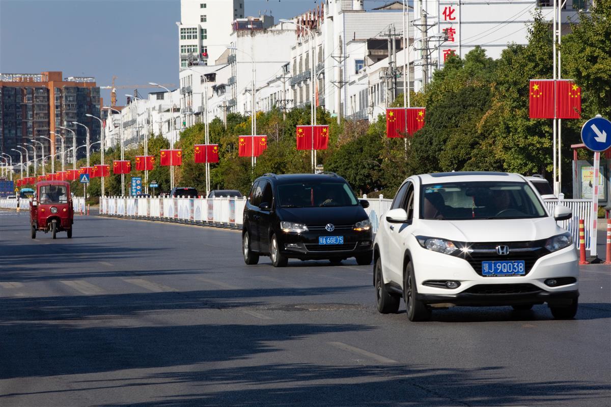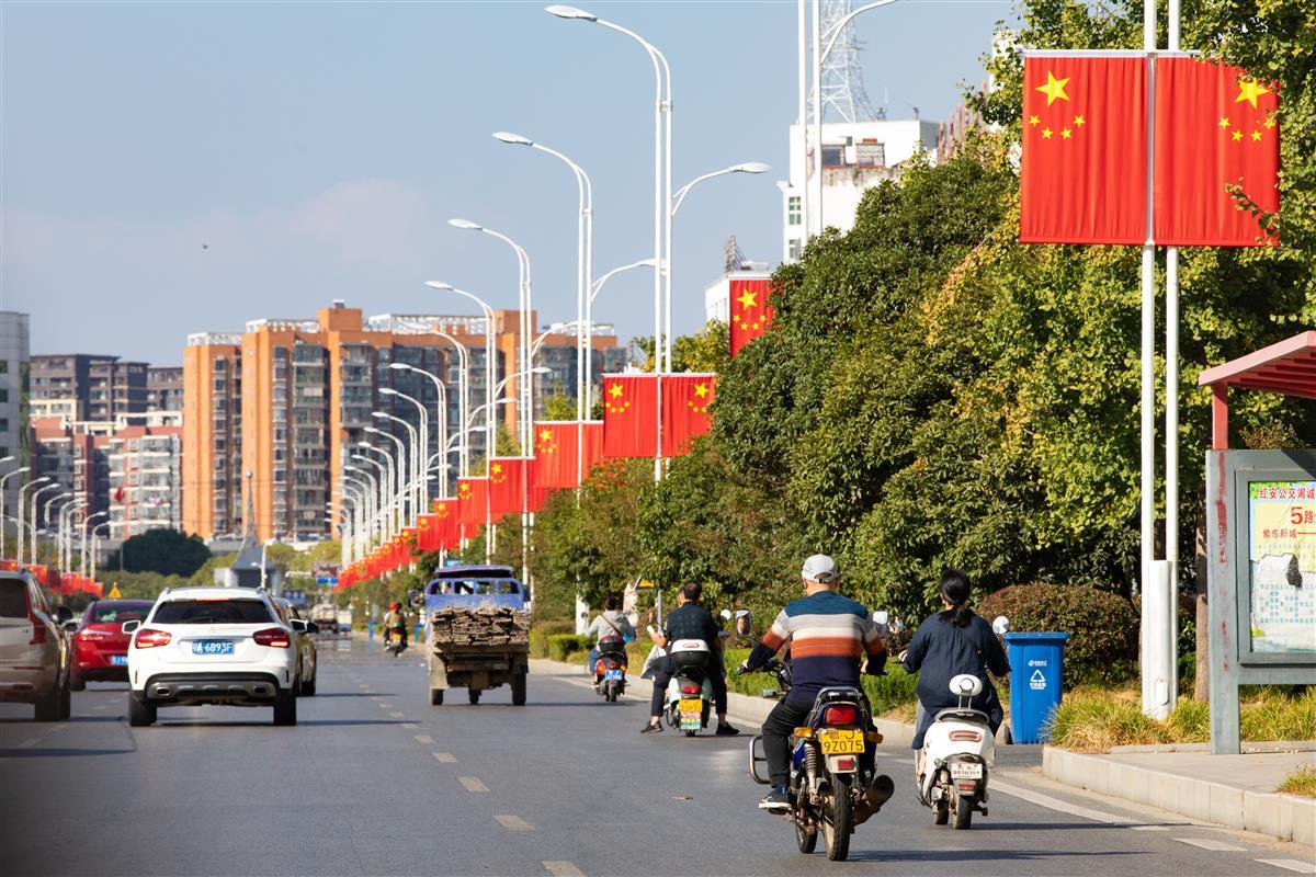 在红安进出城区主要路段——红金龙大道,一面面五星红旗迎风飘扬,营造出浓浓国庆氛围。