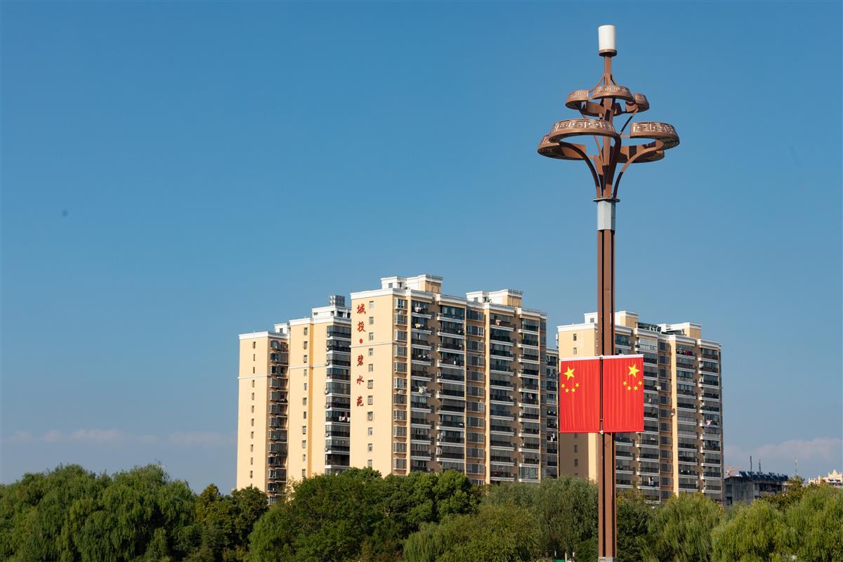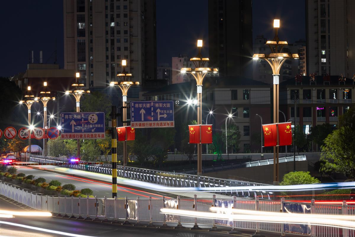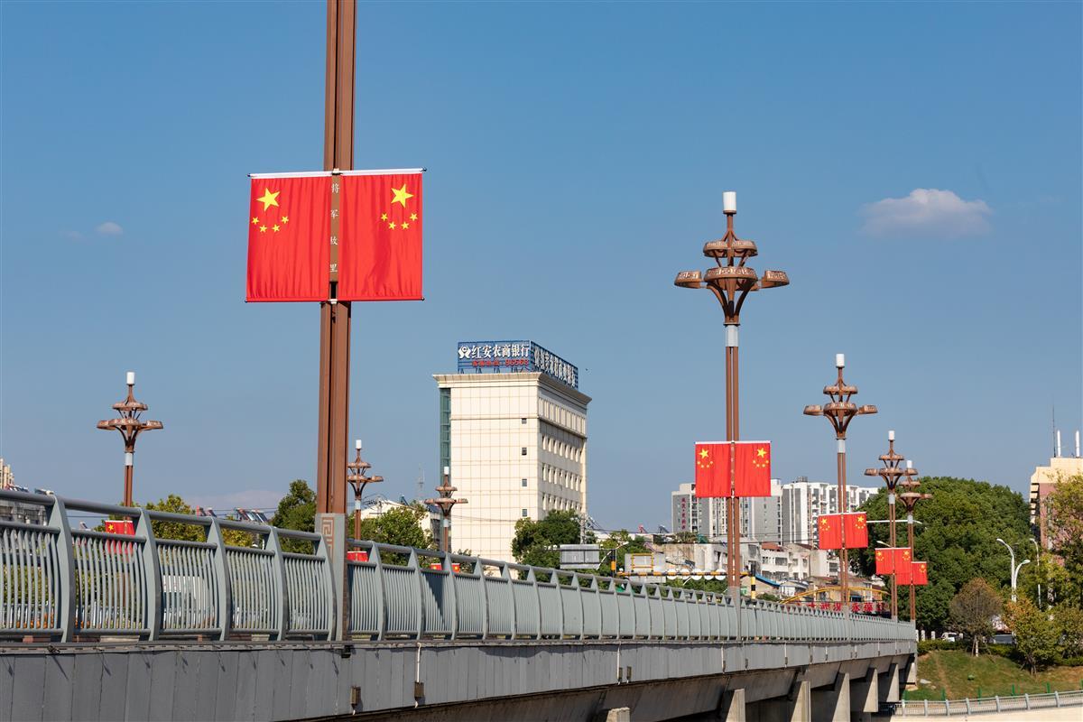 在红安二桥,鲜艳的国旗挂满路灯灯柱,庄重喜庆。