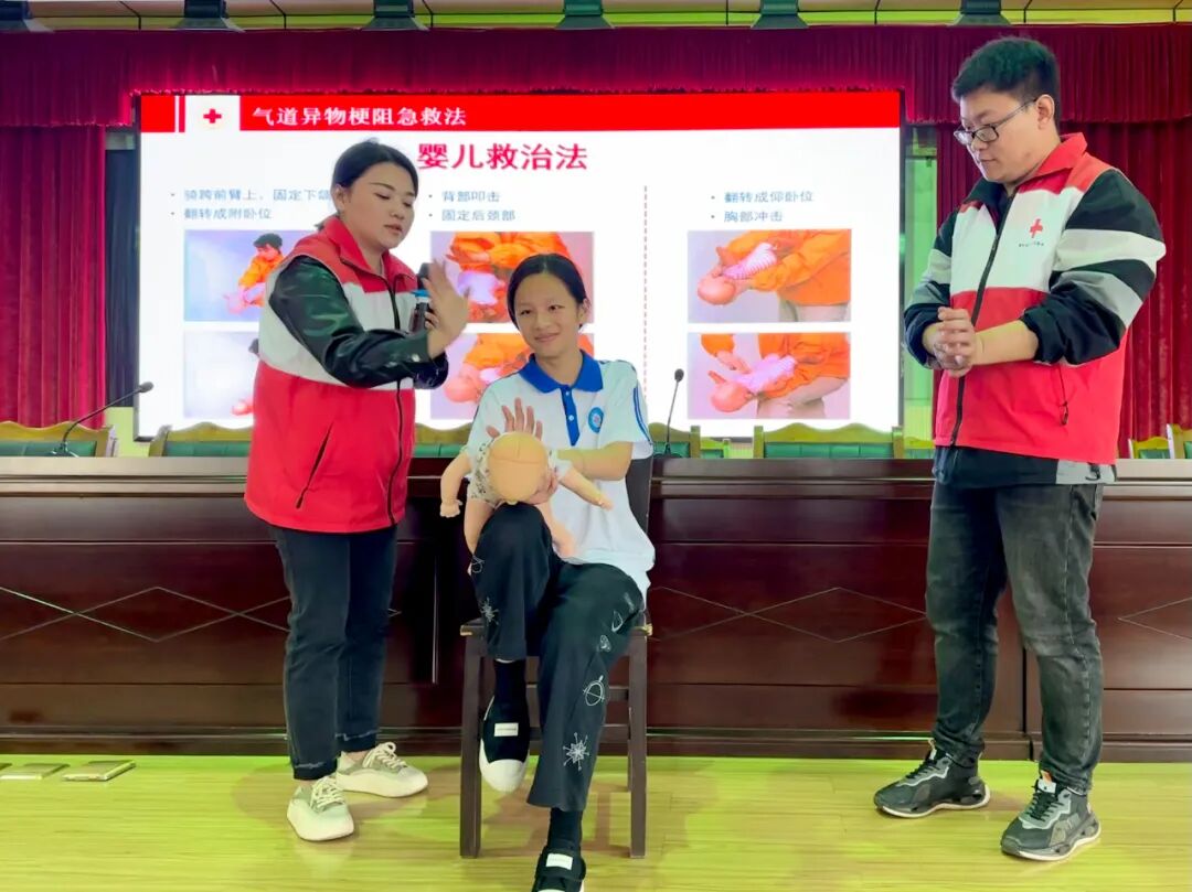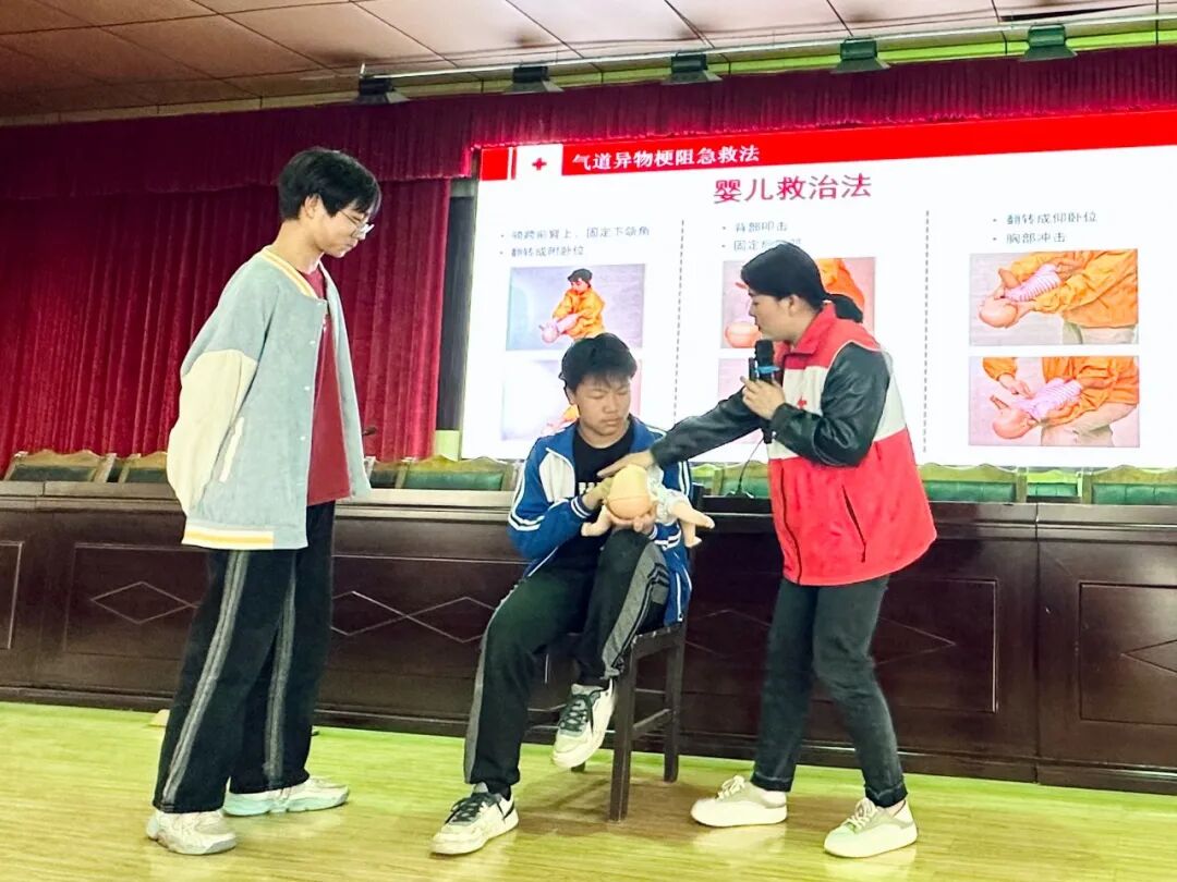 活动中,县红十字会办公室主任、应急救护师资张贝围绕红十字运动基本知识、救护概论、心肺复苏、气道异物梗阻急救法以及常见意外伤害和突发事件的应对与处理等进行细致讲解,通过情景模拟吸引学生兴趣,着重为同学们演示徒手心肺复苏、AED的正确使用及海姆立克急救法,同时邀请学生上台参与实践操作,增强了同学们在突发意外事件中的应急处置能力。