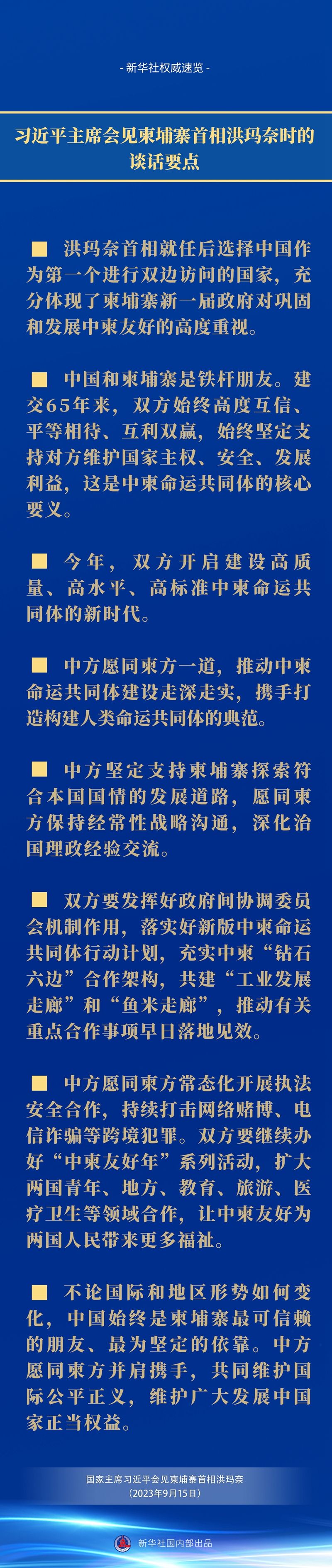 新华社权威速览|习近平主席会见柬埔寨首相洪玛奈时的谈话要点