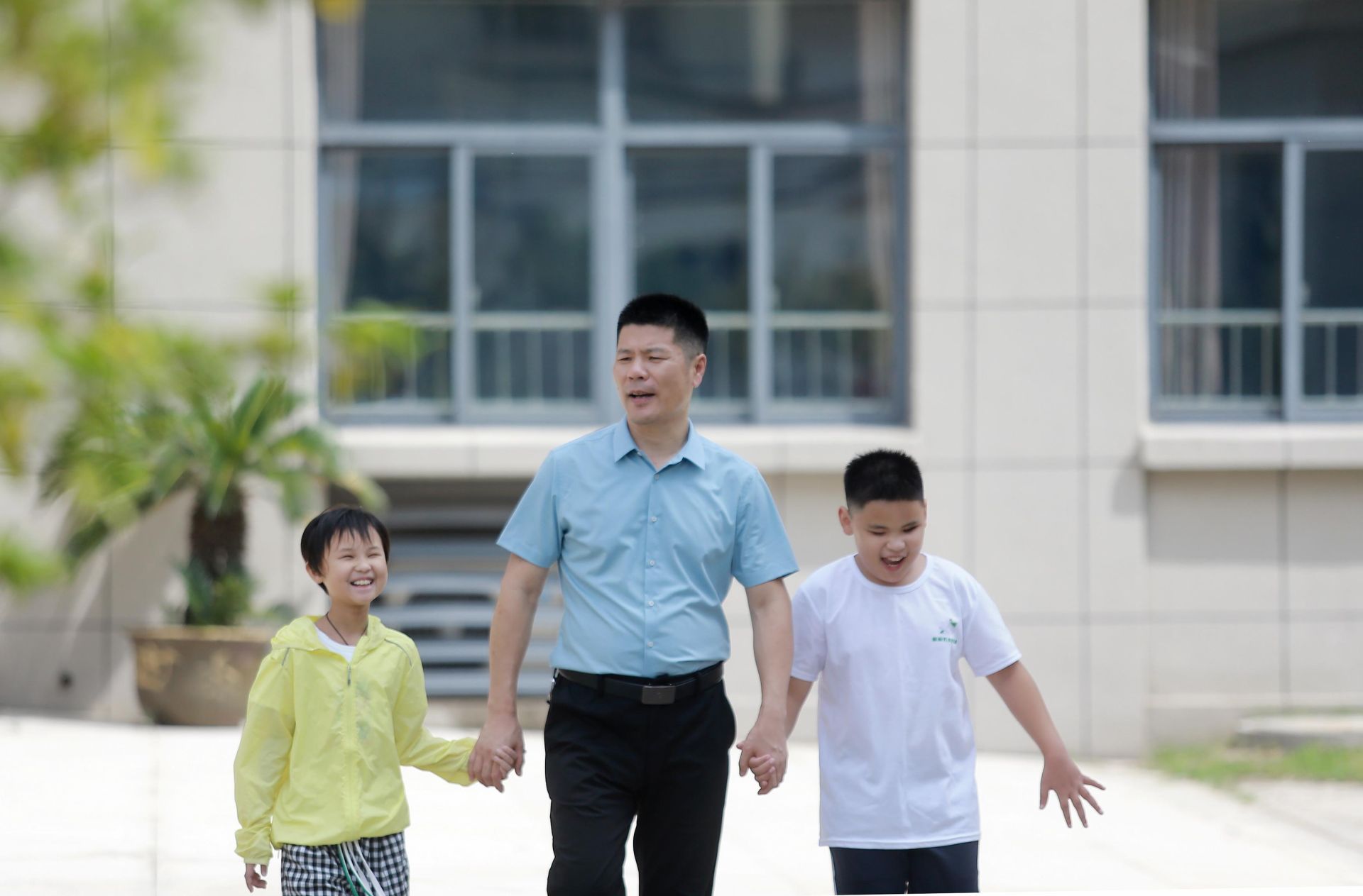 △2023年9月7日,江苏省扬州市特殊教育学校的孩子们和老师一起在校园里散步。
