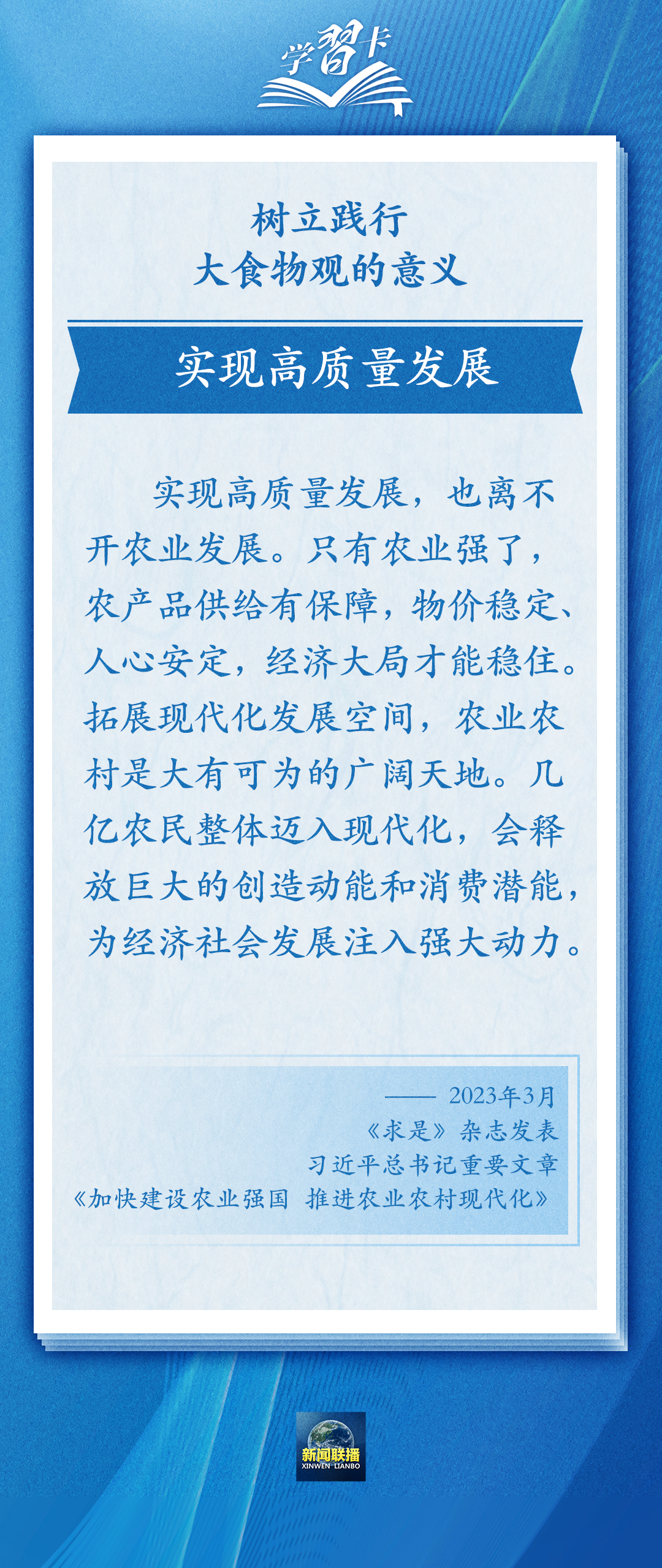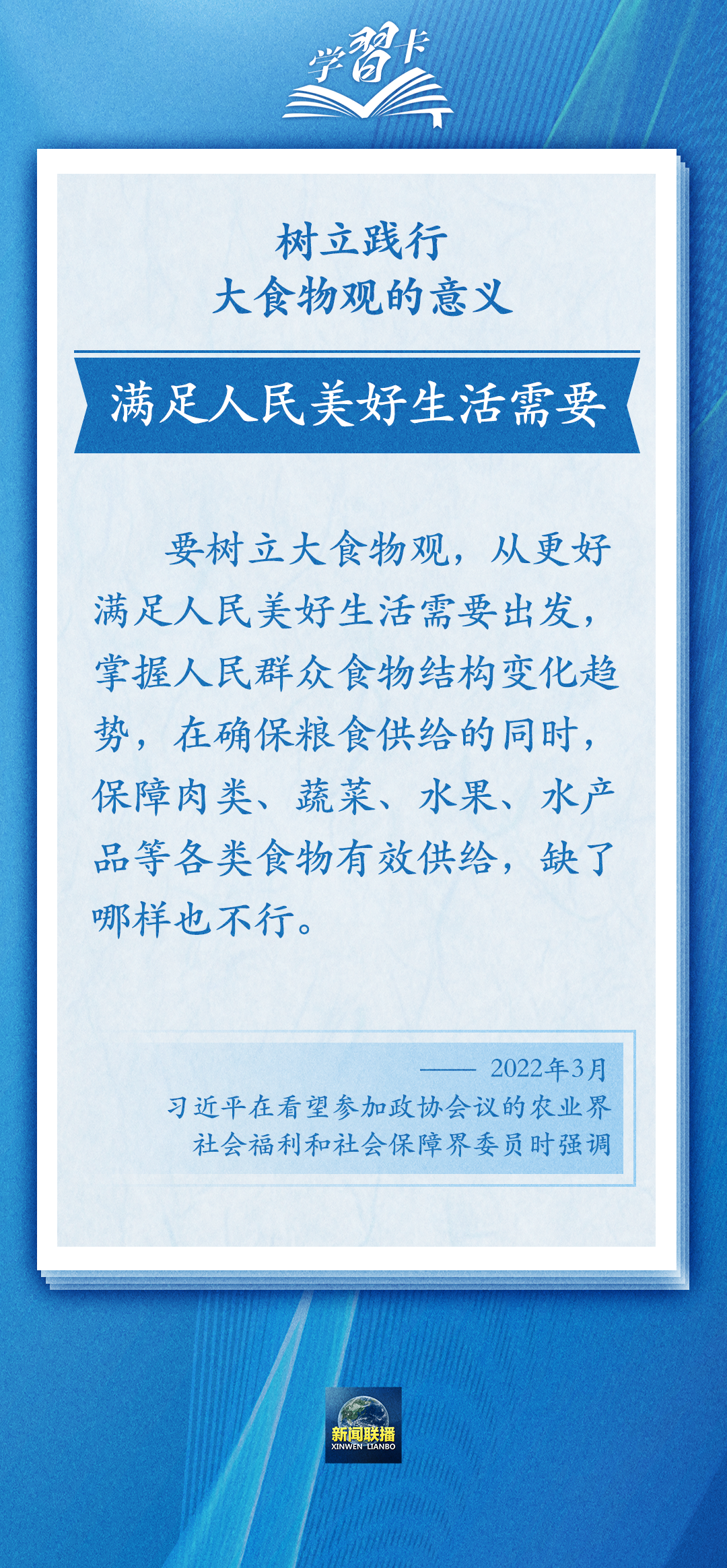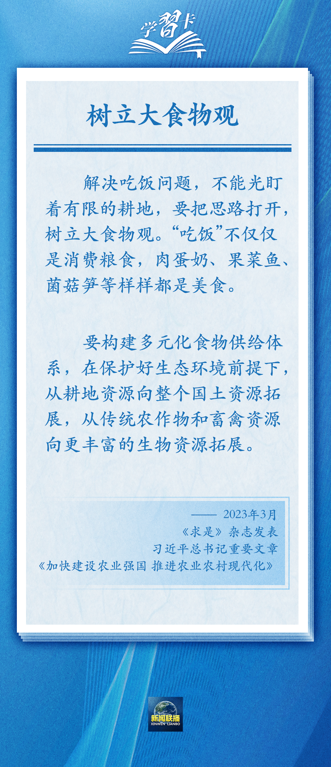 今年4月,总书记在广东湛江考察时指出,要树立大食物观,既向陆地要食物,也向海洋要食物。前不久,总书记主持召开新时代推动东北全面振兴座谈会强调,践行大食物观,把农业建成大产业。