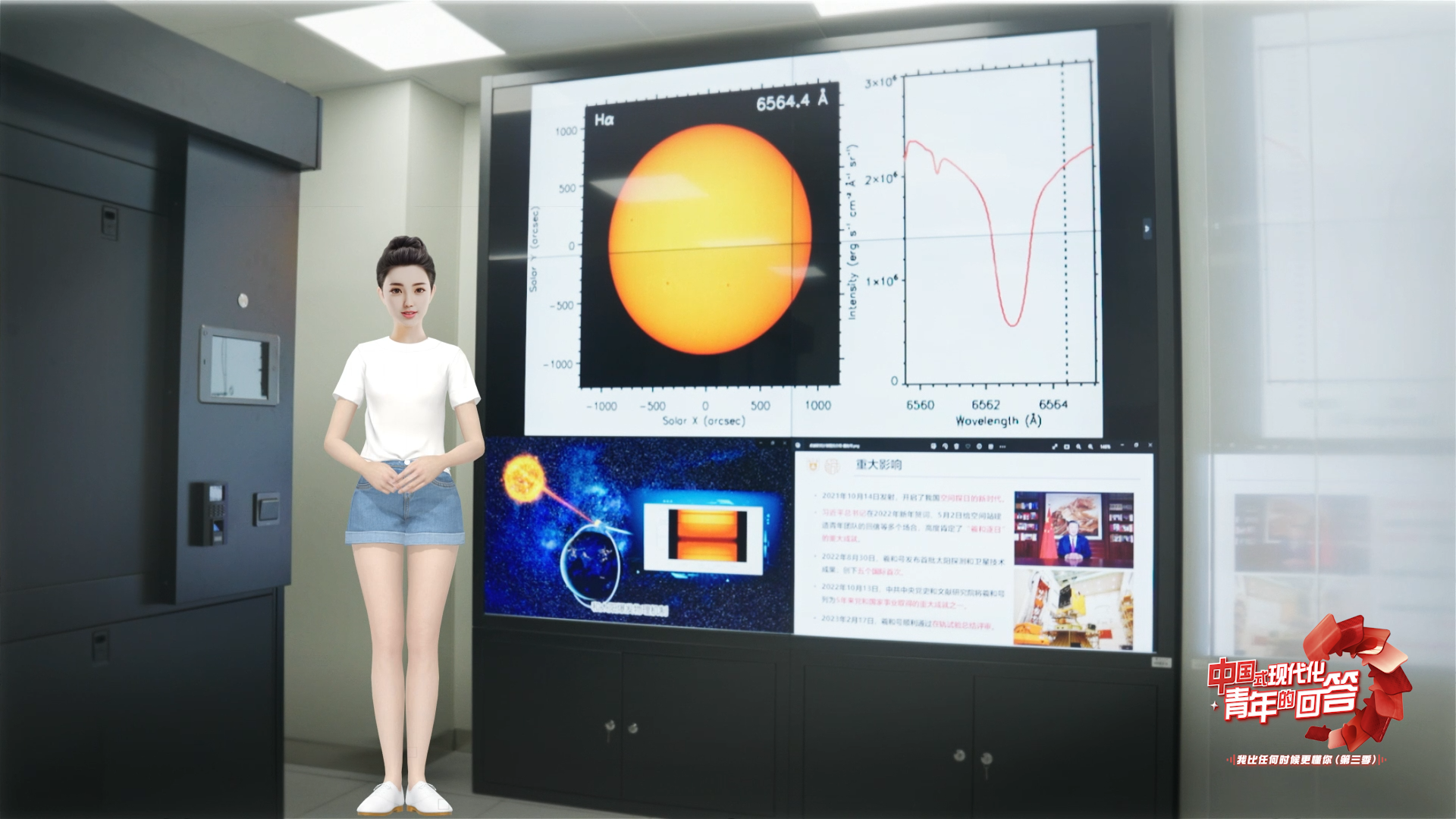什么是Hα谱线?AI数字人小青解释:“Hα谱线是太阳最强最粗的吸收线之一。通过研究太阳Hα谱线,可以巧妙反推出太阳的速度、温度、密度等信息,进而能研究太阳低层大气的等离子体运动和爆发现象背后的机理,对太阳爆发活动作出预报。”