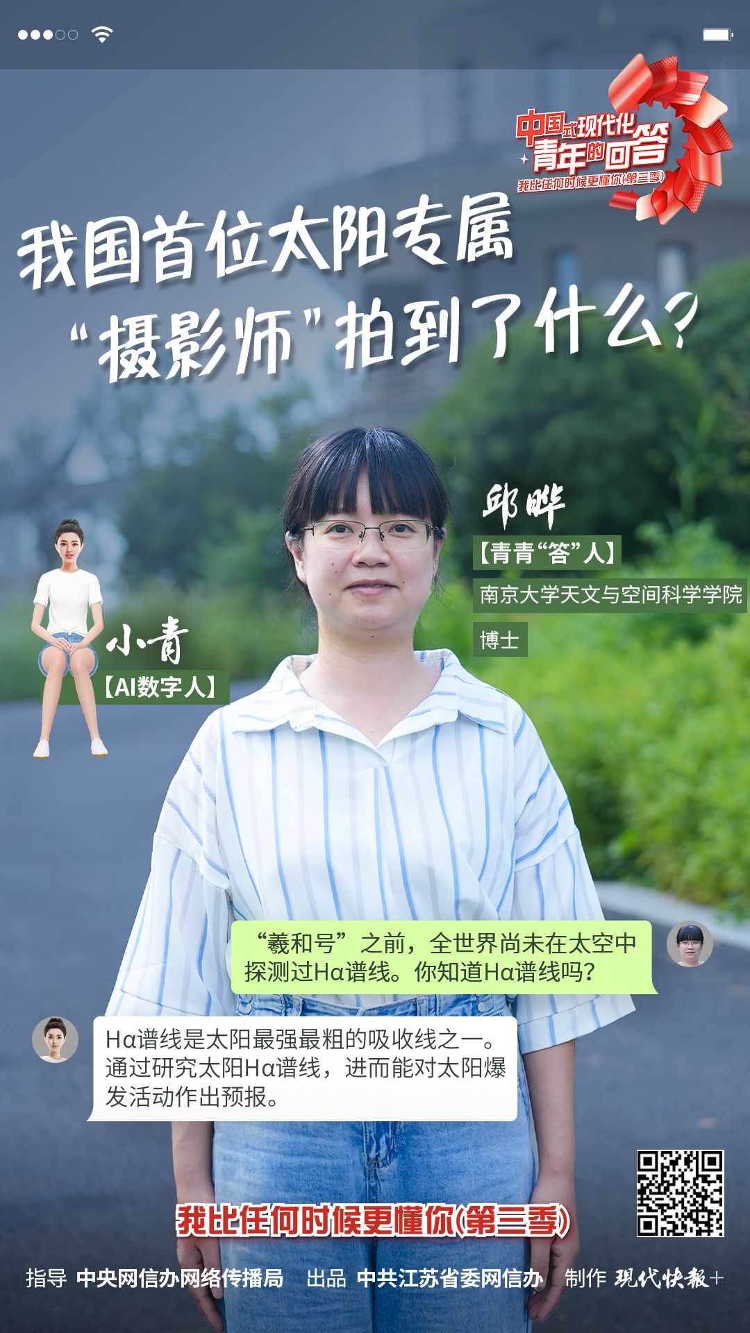 11月7日,“中国式现代化·青年的回答——我比任何时候更懂你(第三季)”系列短视频之《我国首位太阳专属“摄影师”拍到了什么?》正式上线。本集视频中,青青“答”人——南京大学天文与空间科学学院博士邱晔和AI数字人小青,为大家展示了我国首颗探日卫星“羲和号”拍摄到的画面,解释了“羲和号”超长全称里的两个关键词的含义。