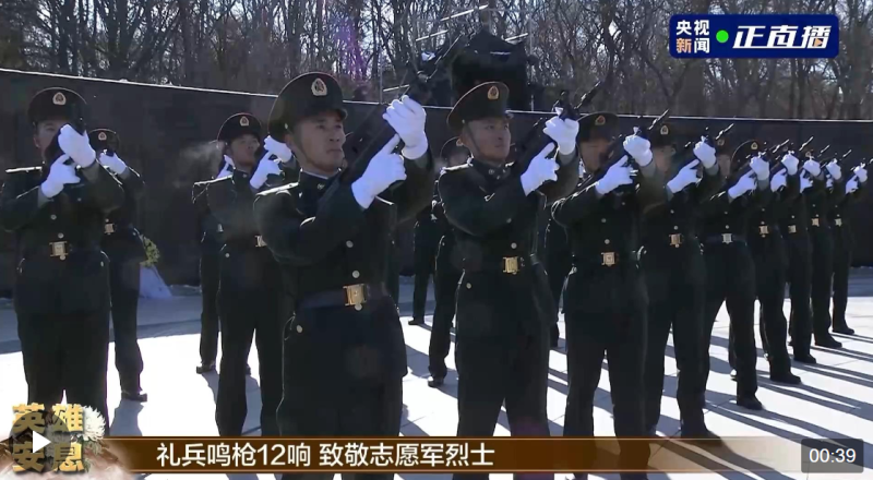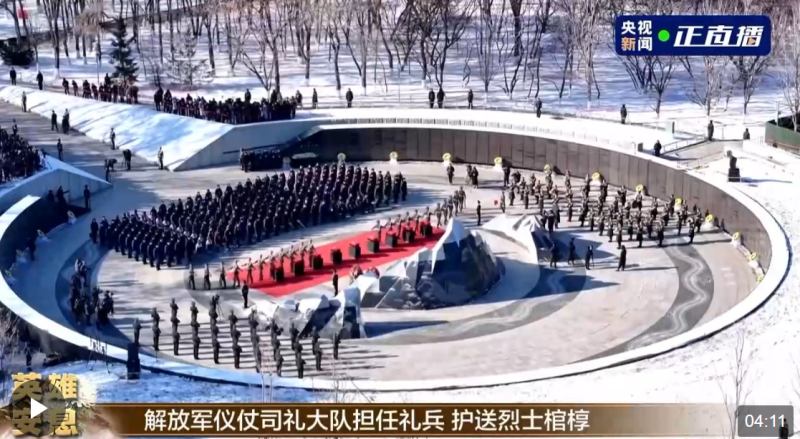 随着《思念曲》再次低回奏响,礼兵们抬起志愿军烈士棺椁绕广场半周,缓缓走向安葬地宫。全场人员凝视烈士棺椁,向烈士献花致敬,并瞻仰烈士英名墙。据了解,2014年至今,累计共有938位在韩志愿军烈士遗骸在这里安息。