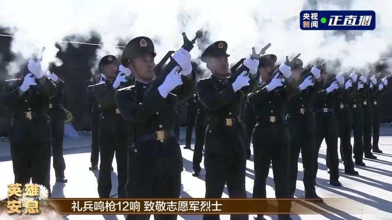 上午10时,军乐队奏响婉转的《思念曲》,在解放军仪仗司礼大队战士持枪护卫下,礼兵护送志愿军烈士棺椁缓缓步入现场,全场奏唱中华人民共和国国歌。裴金佳致祭文后,全体人员向志愿军烈士三鞠躬,27名礼兵鸣枪12响,向英烈致以崇高敬意。