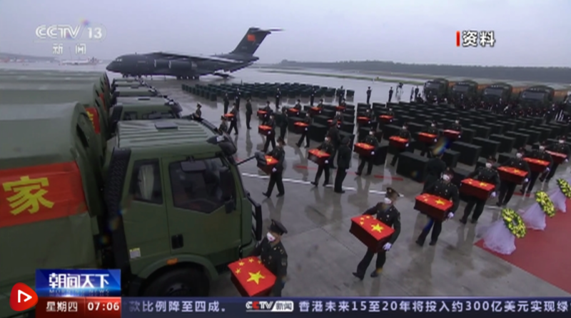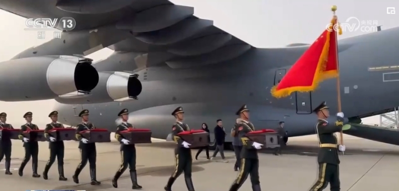随后,中方礼兵护送棺椁走上中国空军运-20运输机。北京时间11月23日上午,运-20运输机从仁川国际机场起飞。