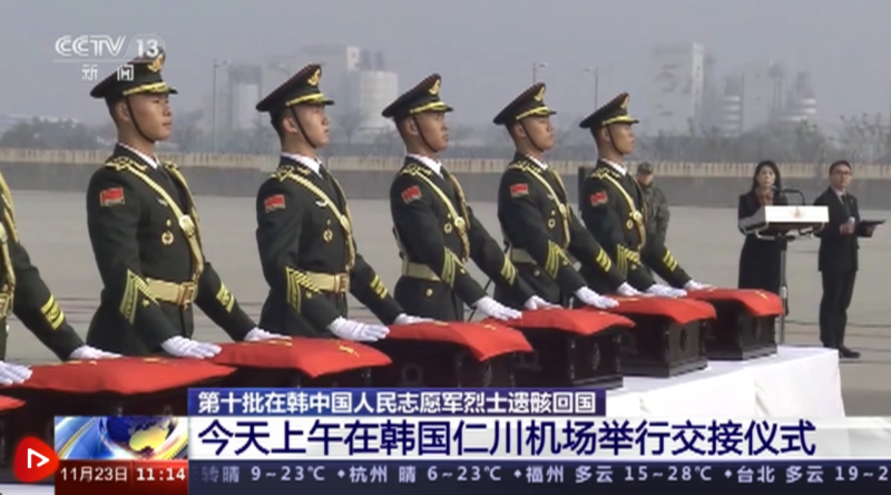 在11月23日的交接仪式上,中方礼兵从韩方礼兵手中接过烈士棺椁,中韩双方签署了交接文件。