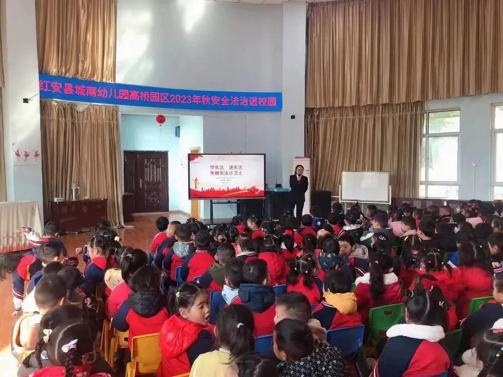 为弘扬宪法精神,营造用宪法维护人民权益的浓厚社会氛围。2023年12月4日,在我国第十个国家宪法日来临之际,红安县人民法院占店法庭干警来到红安县城南幼儿园高桥园区,开展“学宪法 讲宪法 争做宪法小卫士”主题法治教育宣传活动。