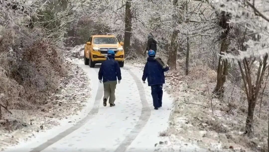 "车辆上山前一定要捆好防滑链,注意雪天行驶安全!"七里坪镇供电所负责人周全在上山前不断叮嘱。天台山上10千伏天16开关对天河线客户密度虽然不大,但线路走廊情况复杂,抢修路途中,部分路段车辆无法前行。供电人员只能下车深一脚浅一脚背着工器具踏雪前行走向故障点。雨雪导致山路积雪成冰,格外湿滑,路边的树枝都冻成了"冰条",供电人员每前进一步都十分艰难。