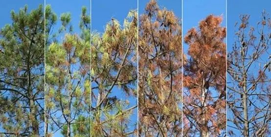 天牛携带的线虫侵入树体后, 松材线虫大量繁殖,线虫个体随松树输导组织迅速遍及全株,造成水分输导受阻、蒸腾作用降低、树脂合成急剧减少。当感病松树不能分泌树脂时,从外观看,针叶失水、褪绿,继而变褐、萎蔫,而后变成黄褐色至红褐色,最后整株枯死。研究表明,一株松树感染松材线虫病最快40天左右就会死亡。