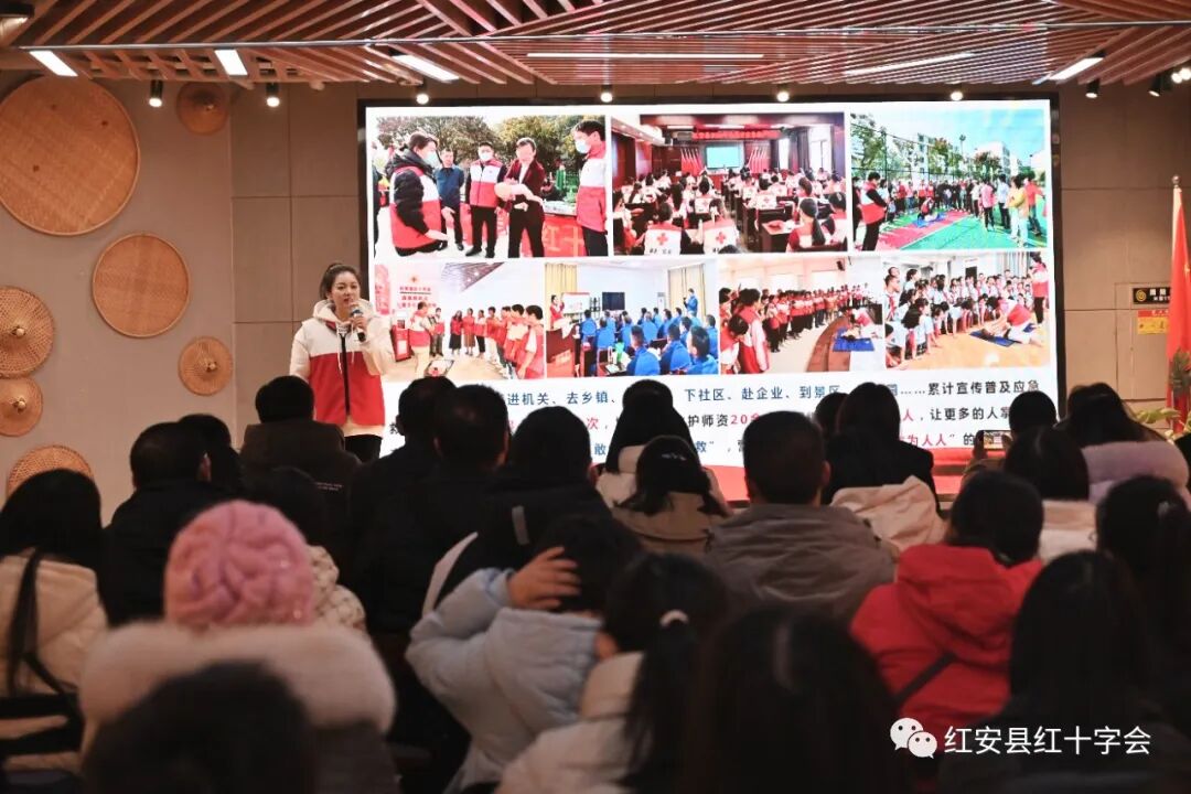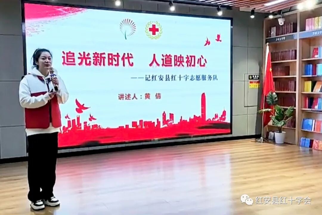 县红十字会黄倩以《追光新时代 人道映初心》为题,宣讲了近年来我县红十字志愿服务队特色服务内容, 红安县红十字志愿服务队为当天唯一讲述志愿团队事迹代表(其余四位均讲述个人先进事迹)。