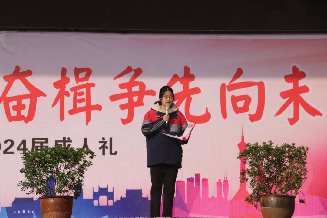 学生代表胡清羽发言,十八岁的成人礼,值得献给所有人,献给迈出的一步步、做出的一个个选择,献给从未放弃的身影,请给自己的十八年岁一场典礼,那是生命的轨迹,成人的证明。