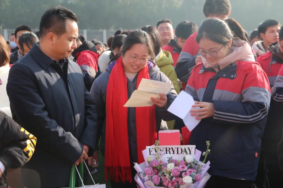 教师代表周静堂送上了最真挚的祝福:希望同学们在高三的战场上,用勤勉和智慧纵横驰骋,用坚毅和执着叱咤风云;无悔于高三,无愧于父母、老师,无愧于青春!愿同学们成人后一路凯歌,实现自我价值;愿我校2024年高考旗开得胜,再创辉煌!