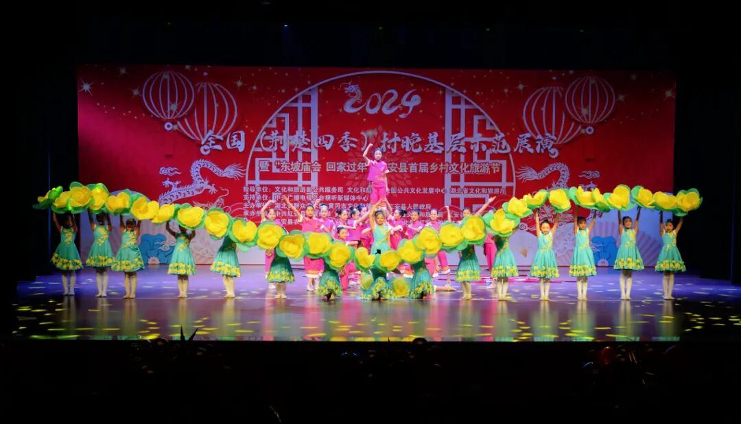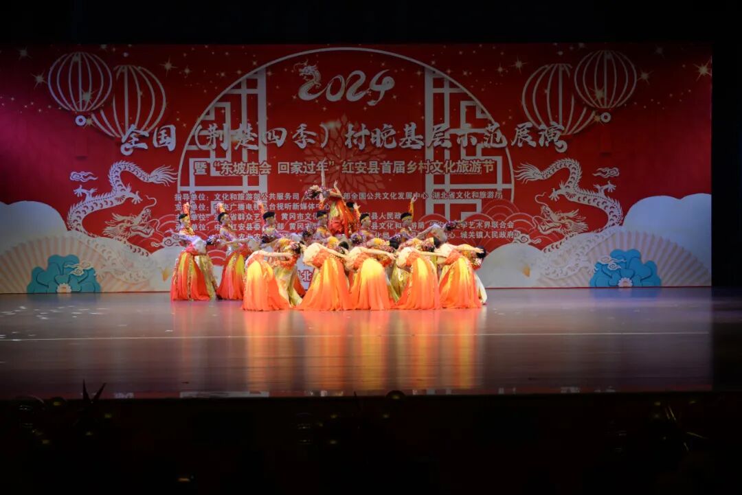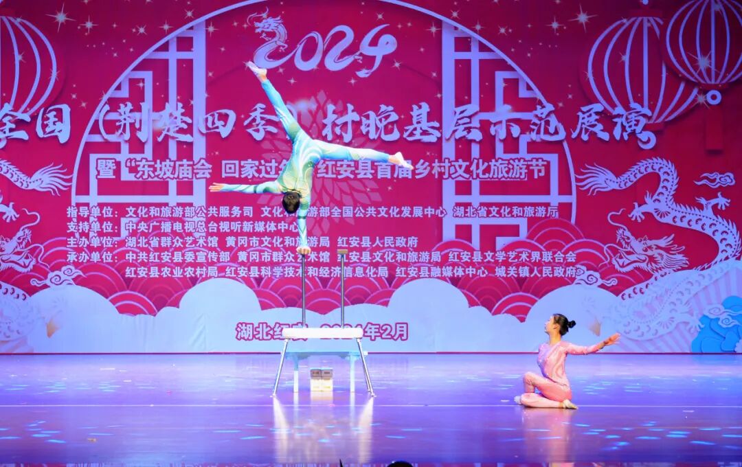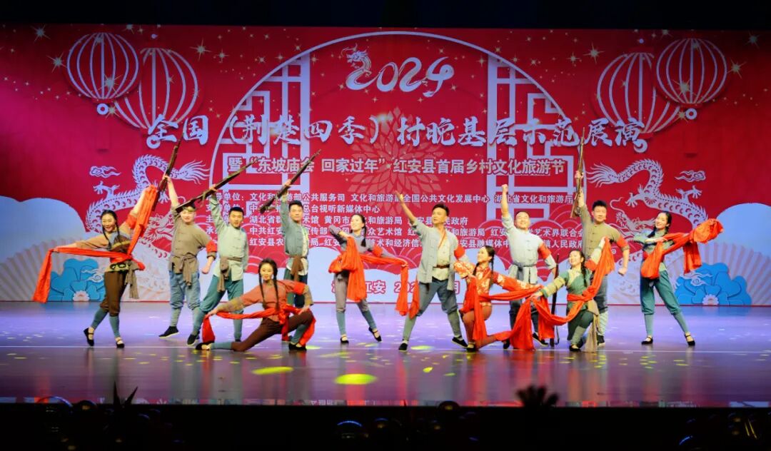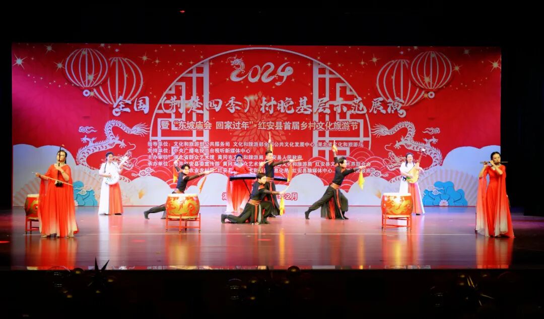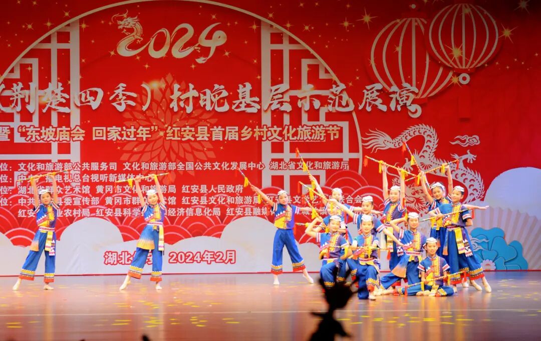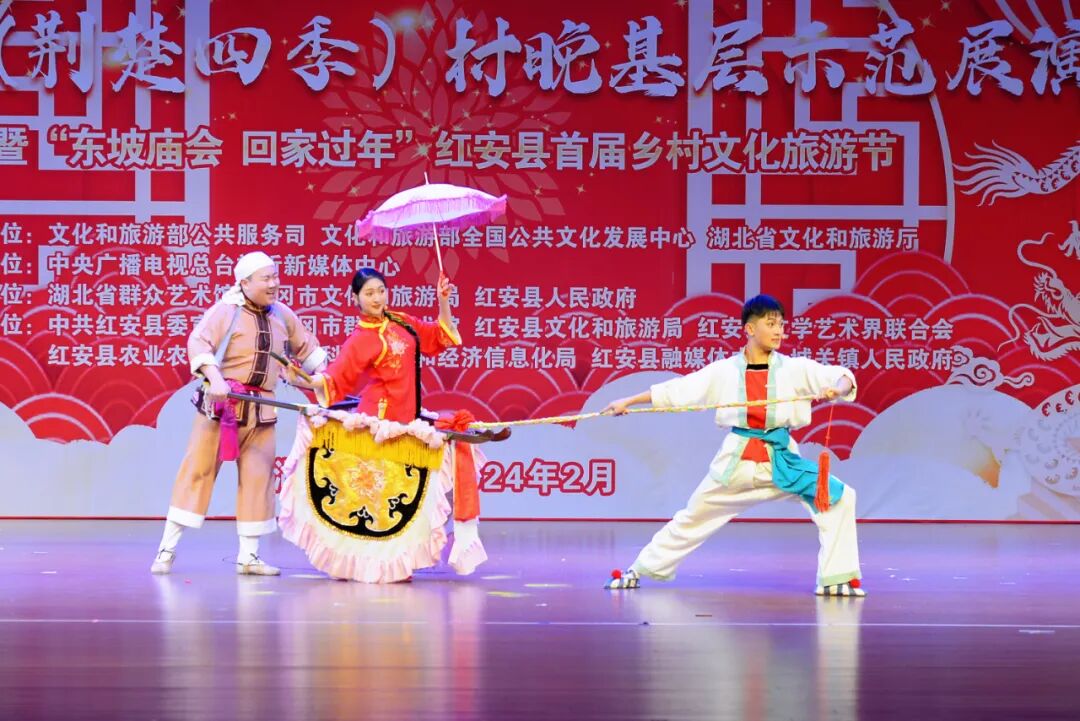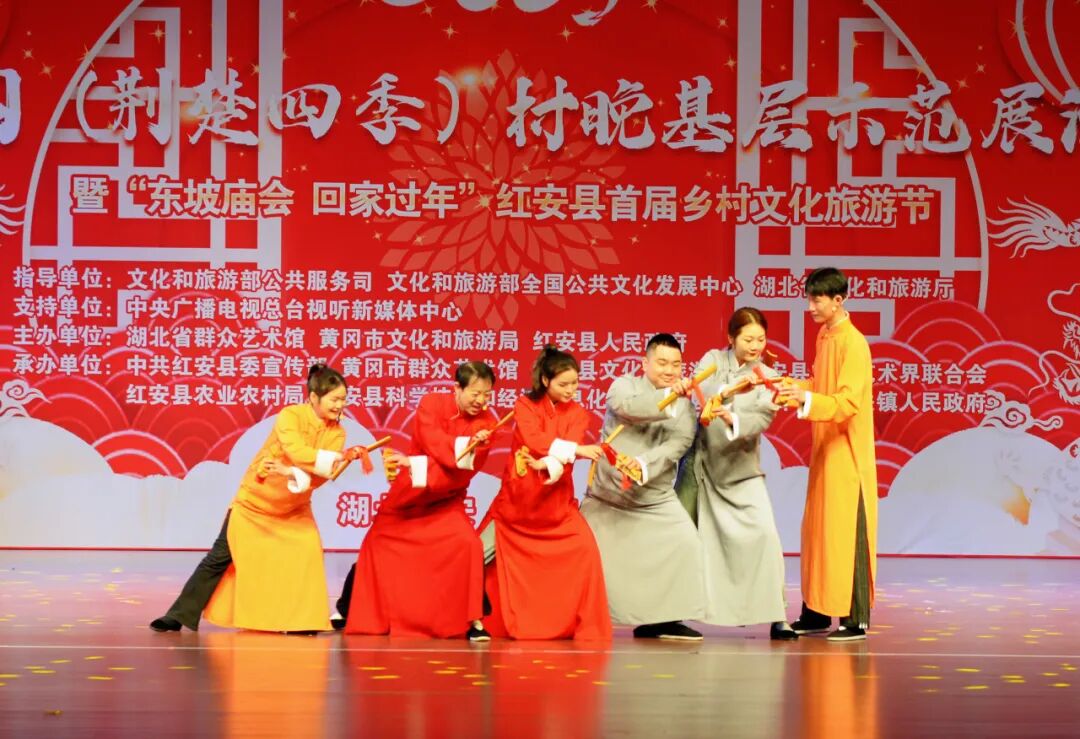 “村晚”舞台,中国电信武汉艺术团与红安县文化馆精心编排的群舞《龙凤呈祥》《相亲相爱》,湖北省群众艺术馆表演的群口快板《看升旗》,黄冈市群众艺术馆表演的民乐合奏《四海平》、民歌联唱《龙船调》《洪湖水浪打浪》《喇叭调》,浠水杂技团表演的杂技《倒立技巧》,红安县实验小学“小小铜锣艺术团”表演的《八月桂花遍地开》《开口就唱幸福歌》,红安县楚剧团表演的《乡村振兴 你我同行》、楚剧《赶会》等节目轮番上演,好戏连台。