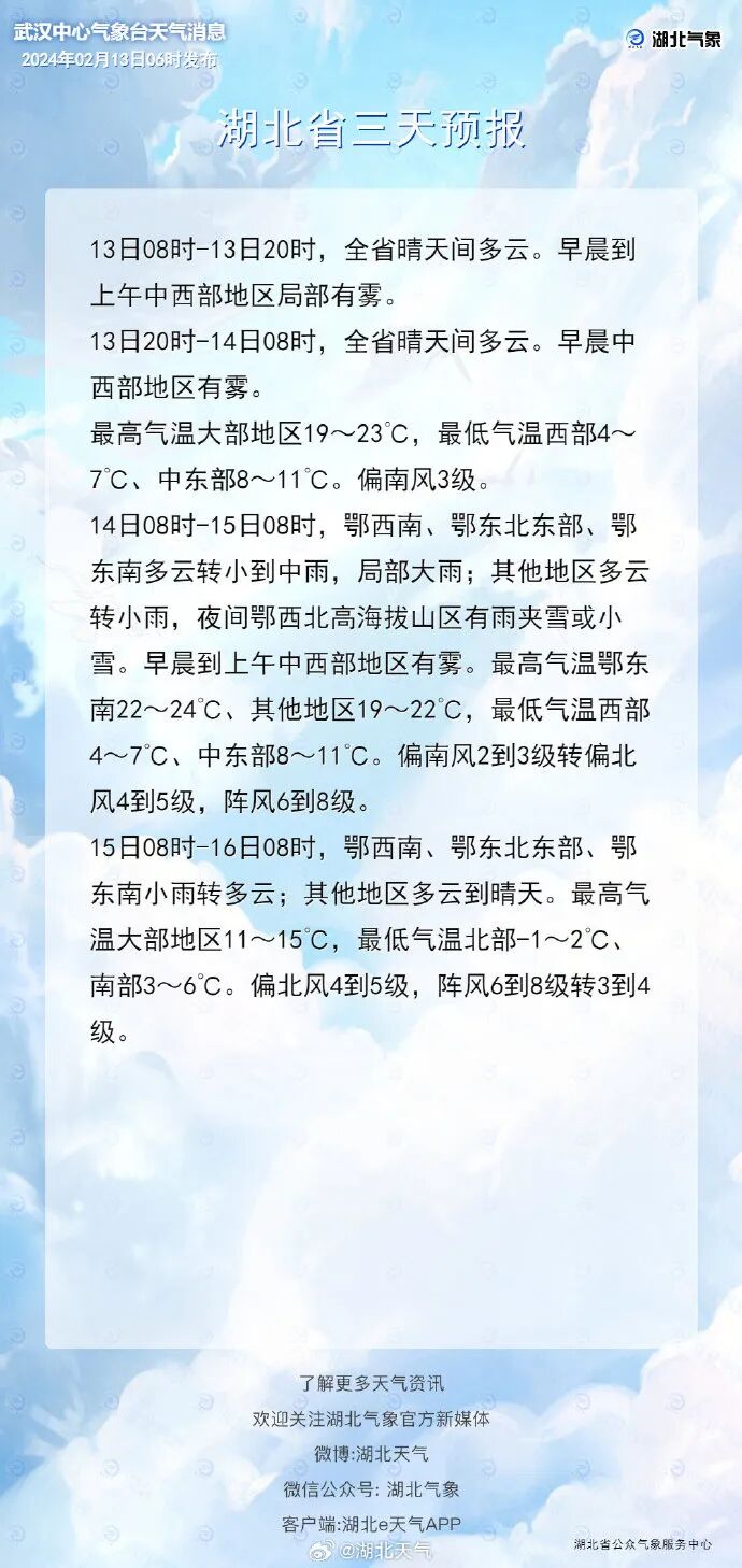 湖北省主要城市天气预报