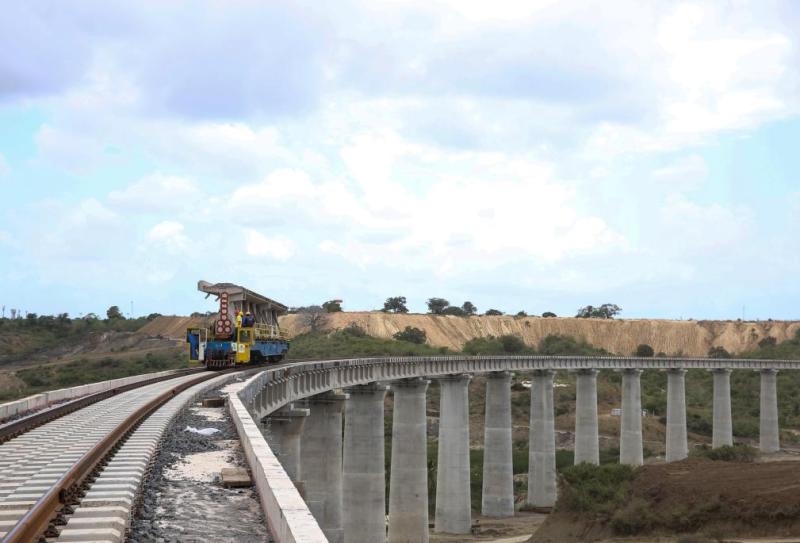 ↑2017年5月12日,列车从肯尼亚蒙内铁路沿线的马泽拉斯铁路大桥上驶过。