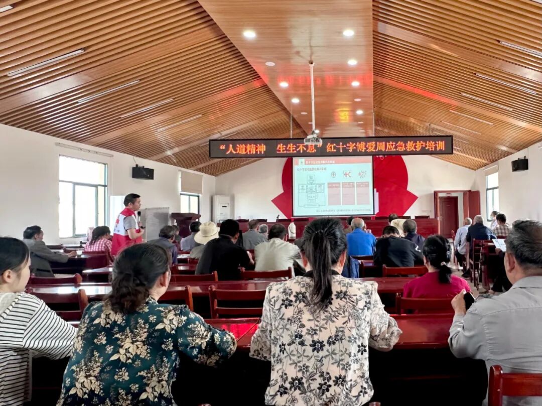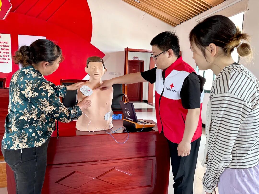 在八里湾镇陶家田村应急救护培训活动现场,县红十字会应急救护培训师资吴春乐、梅鑫一以“关爱生命健康”为主线,系统讲解了红十字运动基本知识、心肺复苏、气道梗阻急救、AED使用、防溺水等急救知识并进行实操演练,八里湾镇卫生院医护人员还为村民提供爱心义诊服务。