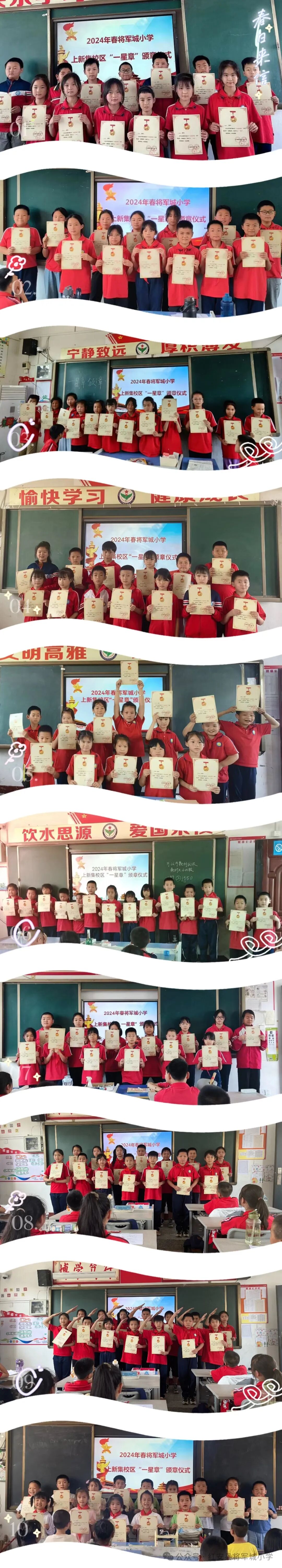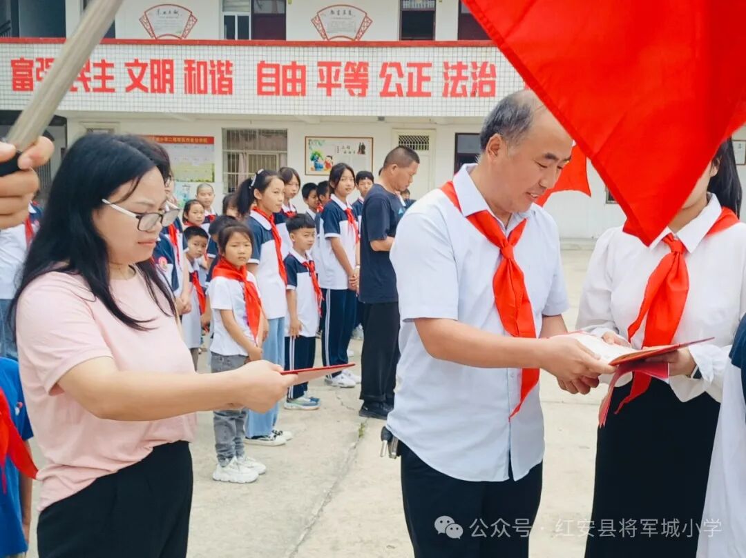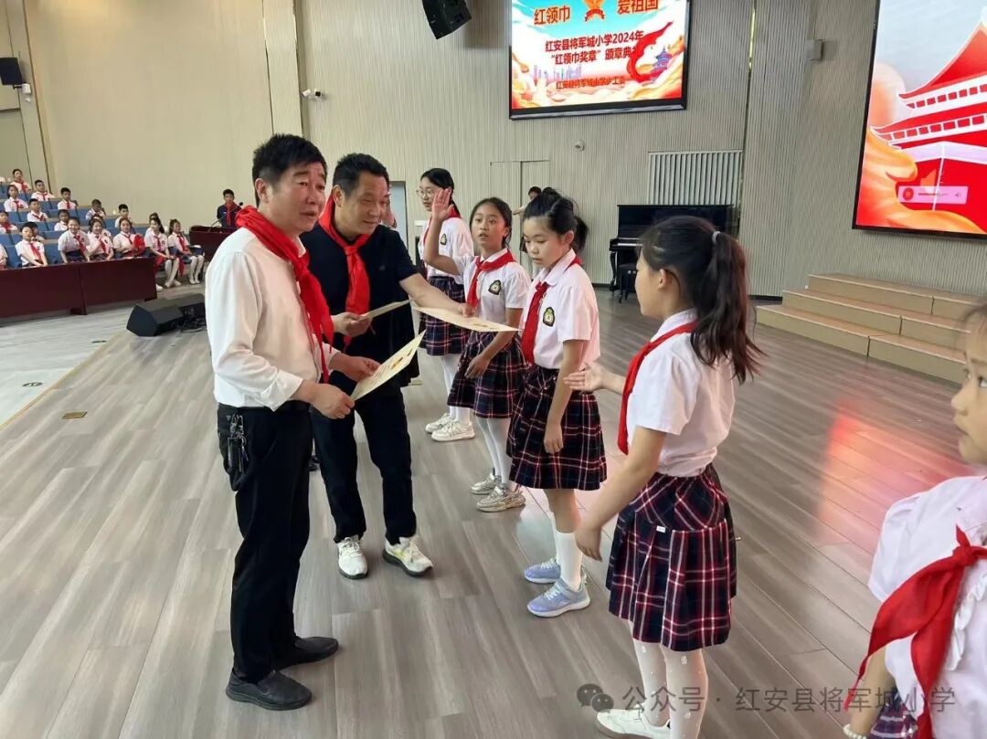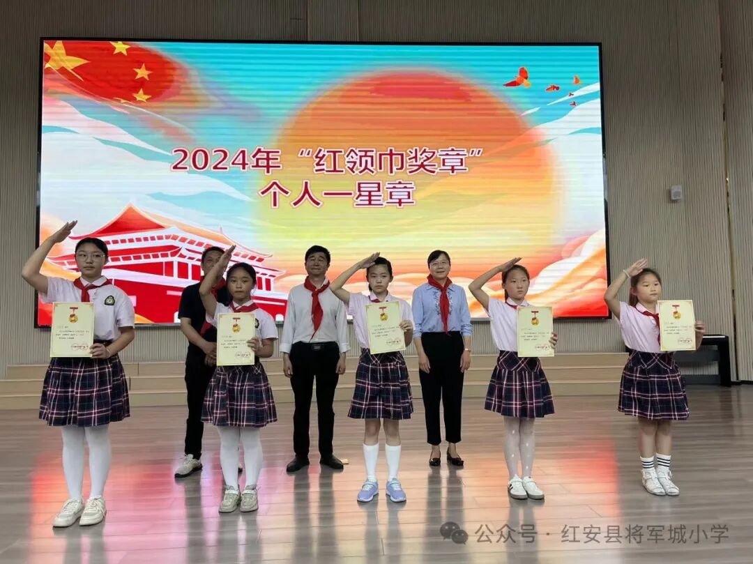 红安县将军城小学为获得2024年“红领巾奖章”个人一星章的队员代表颁发证书并合影留念。并寄语全体少先队员学会立志,学会创造,学会做人,高举星星火炬,练就过硬本领,砥砺思想品格,学习先进榜样,永葆爱党爱国之心,争做新时代好队员。